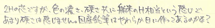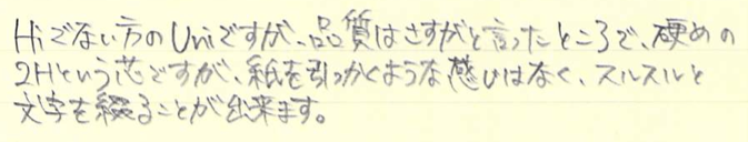 レビュー:三菱鉛筆 uni Category:筆記具 Date:2014年08月04日 先日Hi-uniの紹介をしましたが、本日はuniです。いずれも三菱鉛筆を代表する製品ですね。前回のHi-uniは最近のモデルですが、こちらのuniは少し前のもののようです。 さすがに完全未使用で箱まで残っていたら削れなかったです。このuniもおそらくはダース買いされたものなのでしょうが、箱は見当たらなかったですね。 どこのものとは言いませんが、Hより硬度の高い鉛筆になると、ガリガリと紙をひっかくような書き味になるイメージがありました。このuniはそんなこともなく、さすが三菱鉛筆と言う感じ。 鉛筆を削ったときの香りというのは、何故あんなにも良いのでしょうか。あの香りを集めたアロマがあったら即買いする自信があります。 北星鉛筆の芯がBでとんでもなく柔らかかった印象があり、カステル9000番は2Bでもさほど柔らかくなかったので、国産=柔らかめ、舶来=硬めの図式がわたしのなかで出来つつあります。鉛筆好きとして後試してみたいのは、カランダッシュの銘木鉛筆です。 最近の鉛筆にはJISマークが無くなったかわりに、バーコートが直印刷してあるものが多い気がします。そこでバーコードを逆手に取った軸デザインの鉛筆が出たら面白いと思うのですが、どうでしょうか。 PR