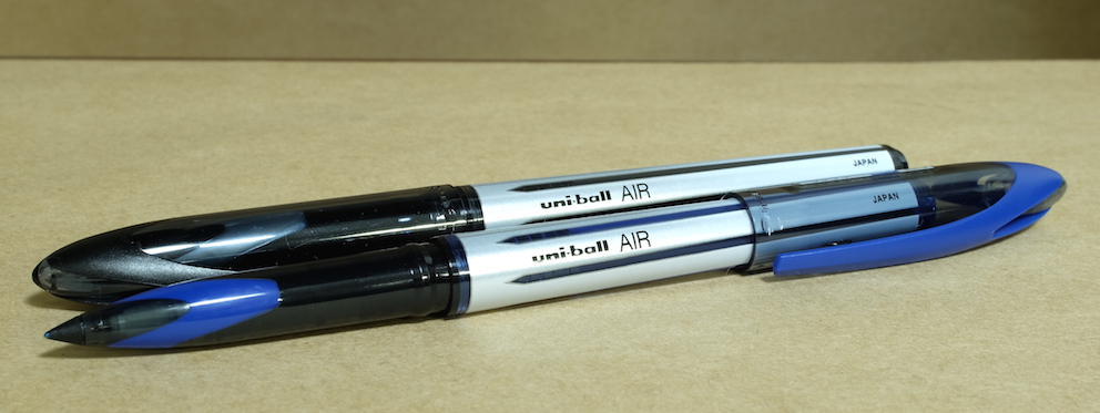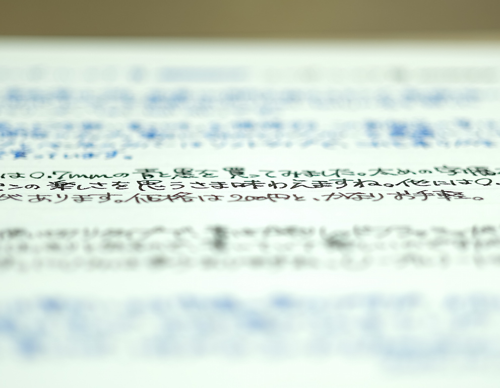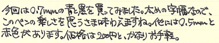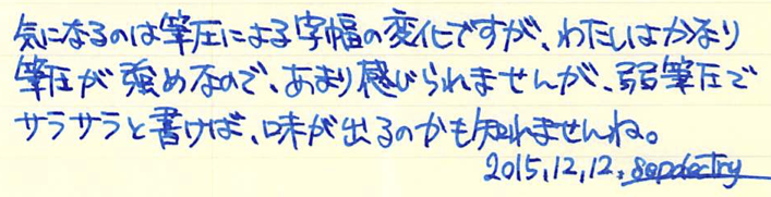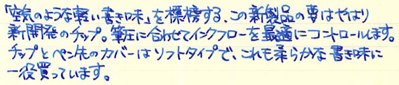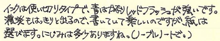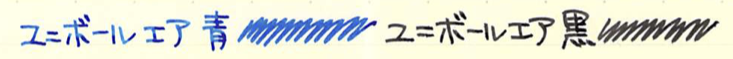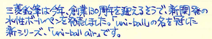 レビュー:三菱鉛筆 uni ball air Category:筆記具 Date:2015年12月12日 uni ball airと書くと、なにやらMacBook Airのようですね。今回は三菱鉛筆の新製品、水性ボールペンのユニボールエアをご紹介します。本当は二種類の字幅を買って比較するべきなんでしょうが、わたしの好みから言って太めの字幅で、黒青を買ったほうが楽しめると思いましたので・・・。 この水性ボールペンはかなり大々的に広告宣伝されまして、話題の商品になっているようですね。新油性ボールペンやゲルインクボールペンが現在は人気ですが、牙城に風穴を空けることができるでしょうか。 「書き味を柔らかくするために、チップとペン先の間のカバーを柔らかくする」なんて安直な発想だと思うなかれ、とても効果的だと思います。このソフトカバーは一人ひとりの書き方に合わせて馴染んでいくそうですよ。 非常に楽しいペンではあるのですが、紙面を選ぶ製品なのは水性ボールペンの宿命でしょうか。ノーブルノートでも滲みますので、良い面も、悪い面も万年筆的な筆記具ですね。 この青色は好きですね。深めのウルトラマリンブルー系。持っているインクだと、摩耶ラピスのような青色です。濃淡もご覧のとおり、かなりはっきりと出ます。中太字の万年筆で書いたような筆跡ですね。 低価格ボールペンと侮るなかれ。三菱鉛筆の130周年にふさわしい、楽しい筆記具です。 PR