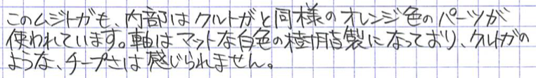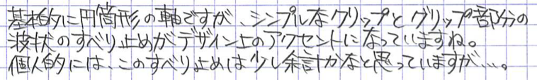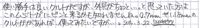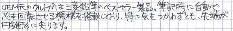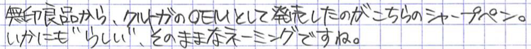 レビュー:無印良品 芯が回って文字が太りにくいシャープペン Category:筆記具 Date:2015年03月22日 間違いなく、わたしが書いた中でもっとも長い名前の記事でしょう。無印良品から出ている、芯が回って文字が太りにくいシャープペンです。この、なんのひねりもないネーミング、いかにも無印良品ですよね。シンプルに見えて実はアクの強いデザインも無印良品の特徴のひとつ。わたしは好きな方です。 クルトガのOEMがついに無印良品から・・・という感じでしょうか。アルミ万年筆はオートのOEM、古くはセーラーのOEMの万年筆なんかもあったような気がします。 この機構は芯にある程度の筆圧がかからないと動作しないために、万年筆に慣れすぎて筆圧が低くなりすぎるとうまく動作しない可能性があります。比較的筆圧の強い若年層向けの製品なのでしょうか。 この、いかにも無印らしいマットな白色樹脂がいいですね。万年筆もアルミ軸だけでなく、こんな感じの無印無印したものを出して欲しいのですが・・・。プラスマイナスゼロの製品とも相性がいいです。 クリップはともかくとして、グリップの滑り止めは蛇足かな、と思っています。もっと、もっとただの筒に近づけて欲しい・・・。0.7mmのクルトガを購入して、このムジトガ(仮)に機構を移植できれば・・・なんてことを考えています。クルトガエンジンは太めの芯こそ輝くと思うのですが、どうでしょうか。 PR