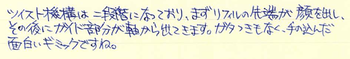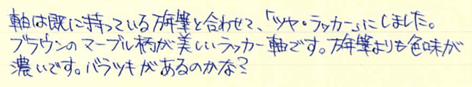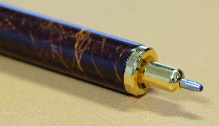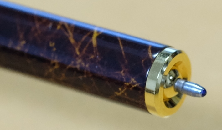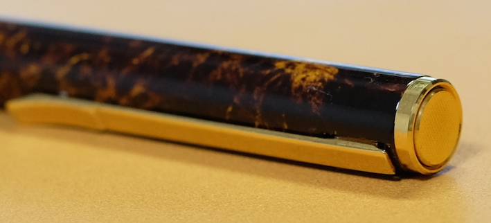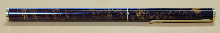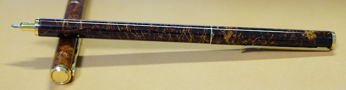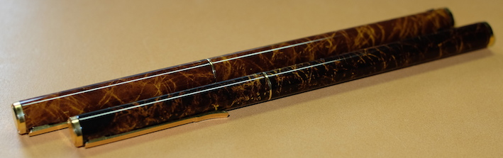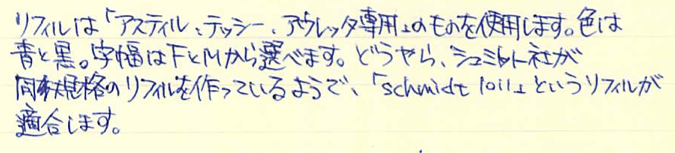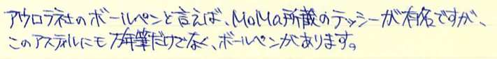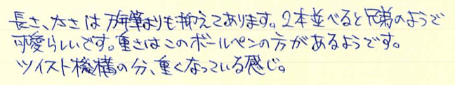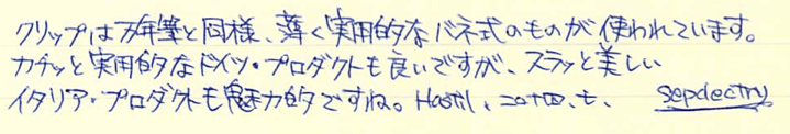 レビュー:AURORA Hastil ボールペン Category:筆記具 Date:2014年07月13日 7月になってから嫌に梅雨めいてきて、今年は季節が一ヶ月遅れなのではないかとうたがっています。夏はどうなのでしょうか。涼しいといいですが。 スペインはマドリードのiguana sellさまはebayにも出品しておりまして、前回アスティルの万年筆を購入した際にもお世話になりました。 ずっと出品されていて気になっていたアスティルのボールペン。ボーナスで購入してみました。ラミー2000やペルナンブコもそうですが、セットで持ちたくなるタイプなので危険です。 下に二本並べた画像を置きましたので、色の違いが分かると思います。これが個体差なのか、そもそも万年筆とボールペンで色が違うのか、はたまた製造年の違いなのかは分かりません。 ボールペンになっても、何とも言えない美しさは健在です。テッシーのモダンなデザインも良いですが、アスティルはどんな仕上げにも合う普遍的デザインだなと思います。 このツイスト機構に惚れ込んで購入してしまったと言っても過言ではありません。非常に手の込んだ機構です。ペン先を仕舞うと見た目は非常にシンプルな筒状になります。 で、筆記時はこんな具合に。かなり寝かせて書くタイプのわたしですが、ペン先と軸の間にもう一段階細いガイドパイプがあるおかげで、問題なく筆記できます。これが軸から直接ペン先が顔を出す形だったら、筆記角度によっては軸が紙にぶつかってしまうかも知れません。 このクリップが非常に良く出来ているんですよ。ちょっと薄すぎて耐久性が心配ですが。なんとも満足度の高いボールペンでした。 PR