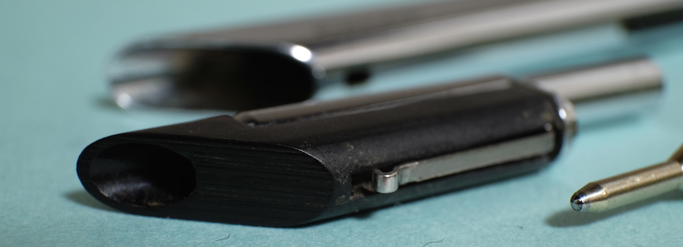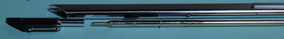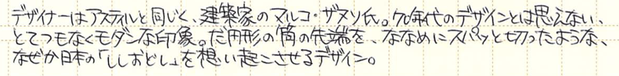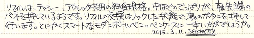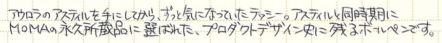レビュー:AURORA Thesi Category:筆記具 Date:2015年03月11日 アウロラのアスティルは大好きな万年筆で、ボールペンまで購入してしまったのですが、今回、アスティルと同じくMoMAの永久所蔵品になっているボールペン、テッシーを手に入れました。アウロラの筆記具はアスティル、テッシー、アウレッタのようなタイプと、オプティマや88のようなタイプに分かれますね。前者はプロダクトデザイン的な感じで後者はアウロロイドなどを使用した、美しい軸が特徴です。 70年代のデザインとは思えない、斬新かつモダンなボールペン。筆記具としてははじめてMoMAの永久所蔵品に選ばれました。確かアスティルのエコスティールと同時期だったと思います。 マルコ・ザヌーソ氏はイタリアの建築家でありプロダクトデザイナー。ドイツのリチャード・ザッパー氏と組んで数々の家具、家電製品を世に送り出しました。面白いのは、この二人がデザインしたテッシーとダイアログ1が似ている点ですね。いつかは比較して記事にしたいと思います。 アスティルはツヤ・ラッカーのような、ゴールドトリムのラッカー軸もうまく合うのですが、このテッシーはどうでしょうか。ラッカー軸は見たことがないのですが・・・。 このクリップがまさに芸術的な出来栄えで、引き出しても使いやすいですし、普通にポケットに差し込んでも使いやすい。そしてこの薄さ、美しさ。なんともスマートです。このクリップを体感するためだけでもテッシーを手に入れる価値があります。 わたしはうっかり、アスティルともリフィルが兼用だと思っていたのですが、テッシー用はアウレッタと兼用なのですね。軸のペン先側のボタンを押して、リフィルとペン先部分を分解します。このリフィルはペリカンなどのビンテージボールペンに適合するらしいです。リフィルもまだ手に入りますし、一本どうでしょうか。 PR