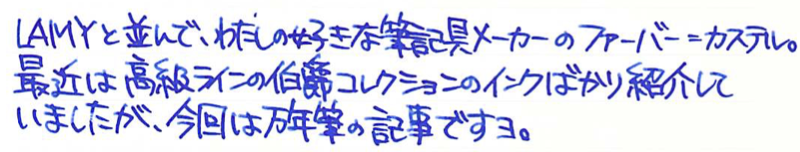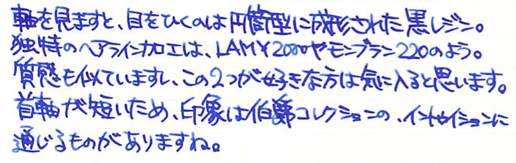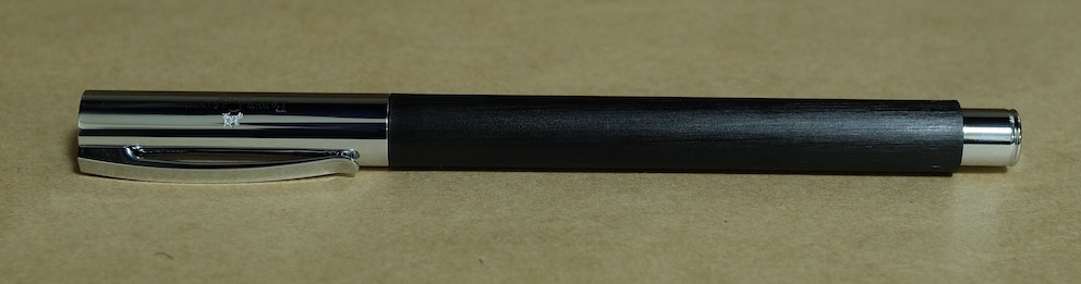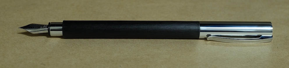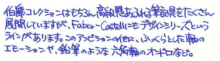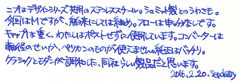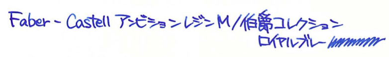 レビュー:FABER-CASTELL アンビション レジン Category:筆記具 Date:2016年02月20日 だんだんと日が長くなってきましたね。寒暖の差が激しいですが、体を壊さないようにきをつけましょう。さて、高級ラインであるグラフ・フォン・ファーバー=カステルの製品ばかりご紹介してきましたドイツのファーバー=カステル社ですが、今回はメインラインの製品です。 ラミー、ファーバー=カステル、モンブラン、カヴェコ、ペリカンと、ドイツのメーカーはどれも好きですが、しっかりとそれぞれ個性があって面白いです。ファーバー=カステルはクラシカルな魅力とモダンな美しさを兼ね備えたメーカーだとおもっています。 アンビションはファーバー=カステルのデザインシリーズに属します。どちらかといえばモダンな筆記具を展開しています。アンビションなんかはその好例ですね。円筒形細軸の、とってもシンプルな筆記具。 アンビションには紹介しきれないほどの軸の素材、仕上げのバリエーションがあるのですがこのレジンは最も基本的な一本ではないでしょうか。ラミー2000を思い起こさせるようなヘアライン仕上げのブラックレジンが、キャップから軸まで一直線のシンプルな軸の魅力を引き立てていますね。 首軸が短く、独特なデザインのこの万年筆は、重量のほとんどが金属製のなめらかなキャップに集中していますので、キャップをポストするとかなりのリアヘビーになってしまいます。ここは伯爵コレクションのペルナンブコも同様。ですので、わたしはキャップをポストせずに使っています。キャップは勘合式ですがパチッと、小気味良い音をして嵌まります。インナーキャップもしっかりしていますしドライアップには強そうですね。クリップは伯爵コレクションにも通じる、曲線を描いた意匠。ファーバー=カステルはチープラインでもこんなクリップですよね。日本では割引されて7000円ほどで手に入りますし、おすすめの一本です。 PR