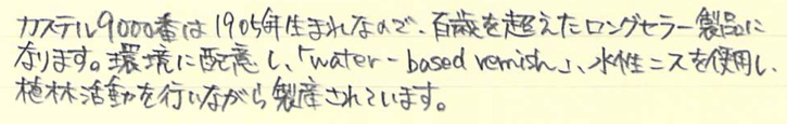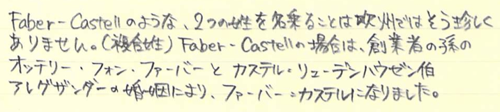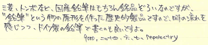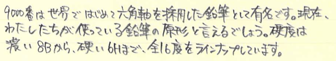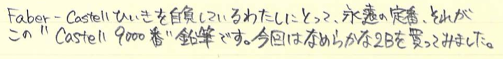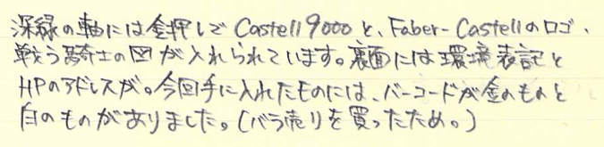 レビュー:FABER-CASTELL CASTELL9000 Category:筆記具 Date:2014年06月07日 9000番パーフェクトペンシルは紹介していましたが、意外にもこちらはまだでした。ファーバーカステルから、カステル9000番鉛筆のレビューです。 9000番パーフェクトペンシルはBでしたので、それより柔らかい芯ということになります。昔は硬めの鉛筆が好きだったのですが、好みって変わるものですねー。 文房具店のアートコーナーにありましたので、アート用途に使えるほど豊富な硬度が用意されているということでしょうか。もちろん、一般筆記にも抜群に使えます。 俗にいう貴賎結婚というやつで、このころはファーバー家は爵位を持っていなかったと記憶しております。カステル=リューデンハウゼン伯爵と婚姻することで、ファーバー=カステル伯爵になり、現在に至ります。ちなみに、この9000番を作ったのもアレグザンダー・フォン・ファーバー=カステルです。 ここまで環境に配意して作られている鉛筆は9000番だけらしいです。伝統を大切にしながら、これからを見据えた製品作りはさすがですね。 金色のものも一体感があっていいですし、白色のものもクラシカルでいいですね。アートイレーサーの金文字とも合っています。セットで使いたいです。 書き味としては、定番製品ながら、他のどのファーバーカステル社の鉛筆よりも良いと思います。使う喜びのある製品ですよ。 PR