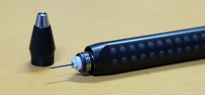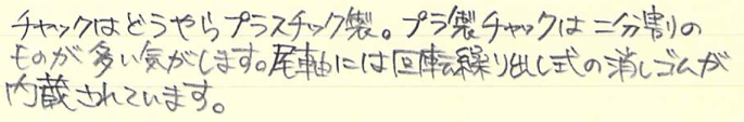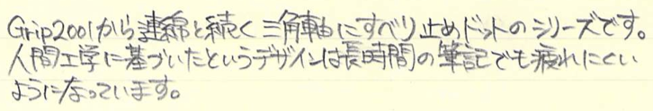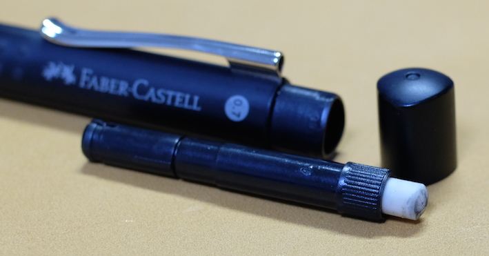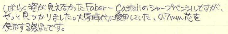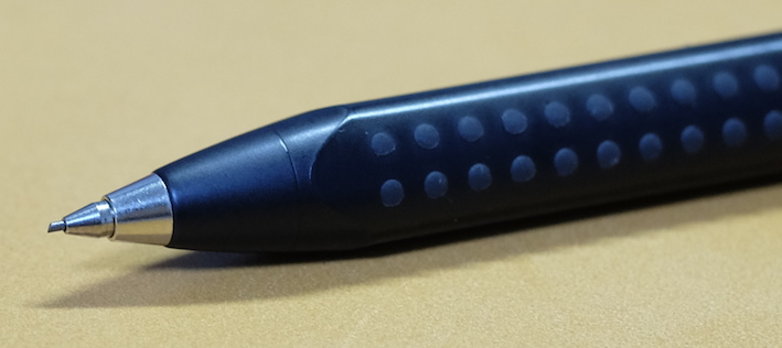 レビュー:FABER-CASTELL GRIP2011 ペンシル Category:筆記具 Date:2014年11月11日 今日はポッキー&プリッツの日ということで、わたしもプリッツサラダ味を食べてましたがこの趣味をはじめてからは、1111は整然と並んだ筆記具に見えてしまいます。ずっと0.5mm芯を使っていたわたしが始めて買った0.7mm芯のシャープペンシルがこのグリップ2011になります。当時はマークシート試験をしていたのでマークが塗りやすいものを買おうということで入手しました。 母に貸してからしばらく姿が見えなくなっていましたが、かばんの中から出てきました。試験をこれで乗り切ったので、なかなか愛着があります。 鉛筆のグリップ2001、使い切りボールペンのグリップ2020など、ファーバーカステルの定番デザインの一つとなった感じもある、この三角軸にドットの軸。太軸であることも相まって、非常に筆記感の良い製品に仕上がっています。 このクリップの形もファーバーカステルの定番で、デザインシリーズから伯爵コレクションまで、多少のアレンジはあれど用いられています。 この回転繰出し式の消しゴムが素晴らしいです。バリオLにも採用されていますが、交換用の消しゴムも販売されていますので、心置きなく使うことができます。 色はマットブラック、ホワイト、ブルー、ピンクにブラックと、多様に取り揃えられています。個人的には、ブランドカラーであるカステルグリーンのものも出してほしいですね。 PR
