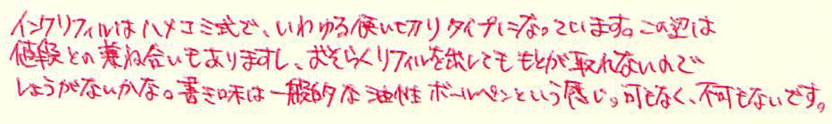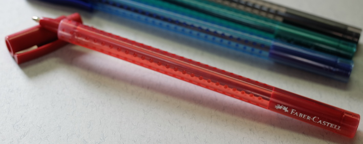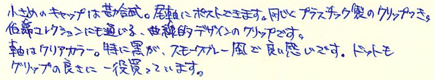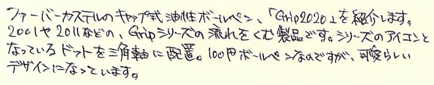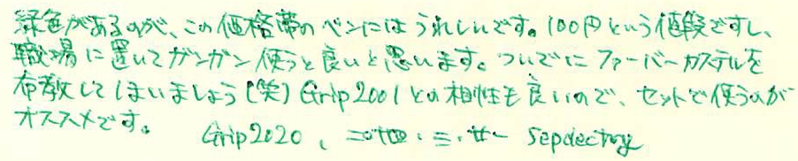 レビュー:FABER-CASTELL GRIP2020 Category:筆記具 Date:2014年03月21日 昨日はブログを始めておやすみしました。同期との飲み会だったのです。 帰ってきてから日付を遡及して記事を書く方法もあったのですが、 そこまで縛ることもないだろうということで今日にもちこしました。 さすがに廉価版の製品のため、軸の先端部分には白化が見られます。 この部分が白化するということは、プラスチックを長く成形して、カットしているのでしょうか。 定番の四色ですね。これだけのカラーバリエーションがあれば、とりあえず困ることはありません。 三角軸にドット。Grip2001のデザインを踏襲しています。 さすがにスプリング式ではないのですが、伯爵コレクションの 曲線的なクリップはかなり好みです。 軸がペン先をカバーするようなデザインなので、キャップも小さいです。 grip2001もスパークルのような色や、わたしの持っているシルバー以外の 色も出ておりますので、gripシリーズは面白い製品展開をしています。 このgrip2020は価格こそ入手しやすいのですが、 実は売っているお店はあまり多くありません。 わたしは地元では買えなかったので、通販で買いましたが・・・。 現品限りだったりするところもありますし、使い切りタイプなので ちょっと心配です。ぜひとも生産を続けて欲しいですね。 PR