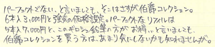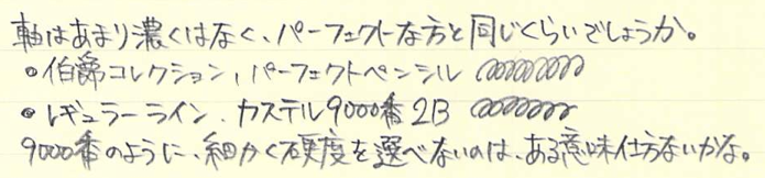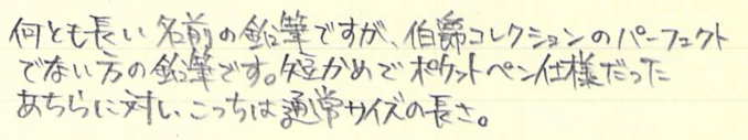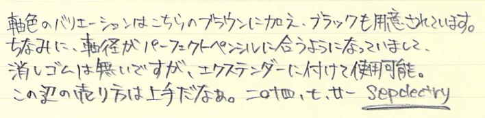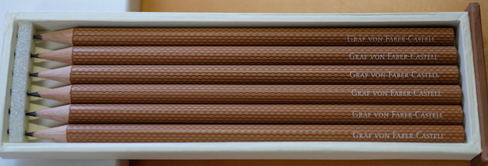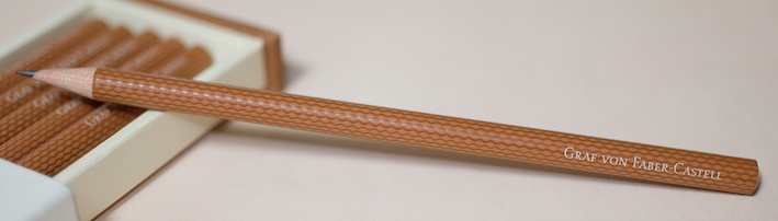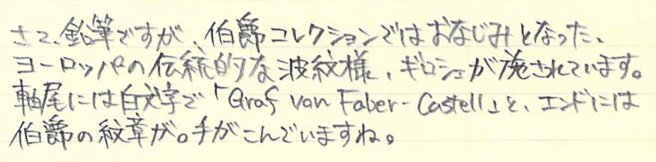 レビュー:GRAF VON FABER-CASTELL Superior Pencil Guilloche Category:筆記具 Date:2014年07月21日 もうすっかり伯爵領の住人になったわたしですが、今回はちょっとしたレアものです。 スーペリアペンシルと名付けられたこの鉛筆は伯爵コレクションのなかでもあまり知られていないかもしれません。おそらく国内でこの鉛筆が手に入るショップはそう多くないはず・・・。 伯爵コレクションには2種類鉛筆があります。一つは皆さんご存知のパーフェクトペンシルのリフィルになる、No.5ペンシル。二つ目はこちらのスーペリアペンシルです。 美しい箱を開けると、そこには整然と並んだ6本の鉛筆が・・・。この雰囲気は伯爵コレクションじゃないと出せないですね。鉛筆という、あくまで消耗品である筆記具に付加価値を生み出す難しさ・・・。 このギロシェ紋様はプリントではなく、しっかりエンボスされていますので、触り心地はざらざら。わたしはギロシェのシリーズは一本も持っていないのですが、手馴染みの良い模様ですね。リブ・パターンもいいですが、こちらも好きになりました。 在庫を抱えられない高級ラインはバリエーションが抑え気味になりますね。個人的には9000番の2Bの書き味が大好きなので、もう少し柔らかい芯にしてもいいかなと思っています。この感想はパーフェクトペンシルリフィルも同様です。 ご覧の通り、軸径はパーフェクトペンシルリフィルと同じくらいですので、通常の鉛筆よりは太く、エクステンダーを選ぶ鉛筆です。 ということで、パーフェクトペンシルのエクステンダーで使う、なんてことももちろん可能。もちろん、パーフェクトペンシルリフィルのように短め鉛筆ではありませんので、ある程度使って短くなった後で、ということになりそうですが・・・。 PR