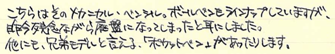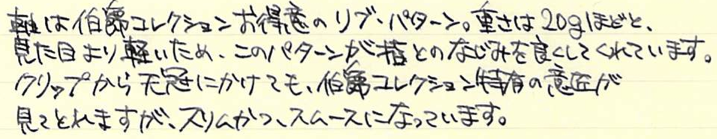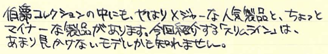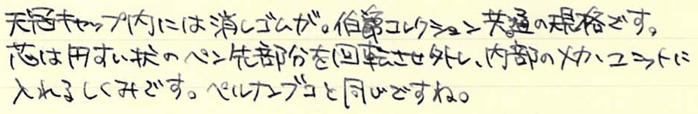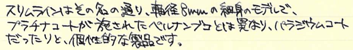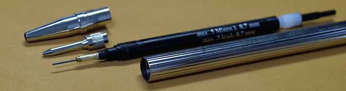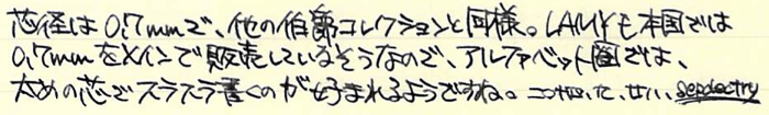 レビュー:GRAF VON FABER-CASTELL スリムライン ペンシル Category:筆記具 Date:2014年09月28日 日曜日の夜は翌日のことを考えるとどうしてもちょっと憂鬱になってしまいますね。そんなときは文房具の記事でも書いて気を紛らわしましょう。ということで、伯爵コレクションからスリムラインのご紹介です。細身かつ意外と長さのあるペンシルで、個人的には絶妙な重心をしていると思います。 パーフェクトペンシルやペルナンブコのような有名かつ人気の製品に隠れて、スーペリアペンシルやこのスリムラインのような製品があります。 それにしても、ラウンドシェイプイレーサーとの組み合わせは何とも言えませんね。この二つは持っている人はなかなか居ないのではないでしょうか。 ちなみに、このスリムラインのボールペンはパーカー互換、ポケットペンのボールペンは4c規格らしいですね。仕事柄メモする場面が多いので、ポケットペンのボールペンは結構前から狙っている製品だったりします。 ペルナンブコなどのペンシルはキャップ天冠部分をツイストするノック方式でしたが、このスリムラインはリブ・パターンとの境目がツイスト部分になっていますので、ノックするうちにキャップが回転してしまうことも無くなりました。 このユニットは非常に良く出来ています。ツイストノックにするにはこうすれば良いのかというのが分かりますね。これも仕組みは一緒ですが、ペルナンブコのユニットとは別物。クロスのスイッチイットも0.7mm。わたしはもう0.7mmに慣れてしまった節があるので違和感は無く使えますが、普段0.5mmを使っている方は随分太いなと感じるかと思います。柔らかめの芯を入れてさらさらと筆記するのをお勧めします。 PR