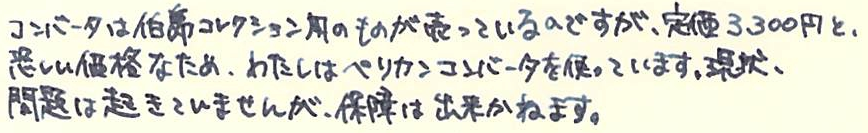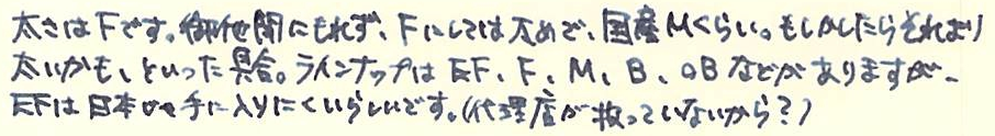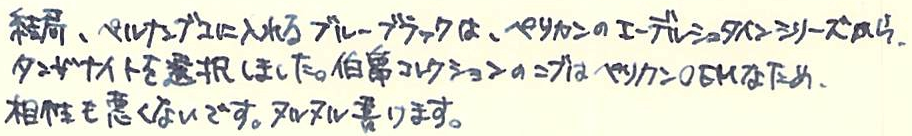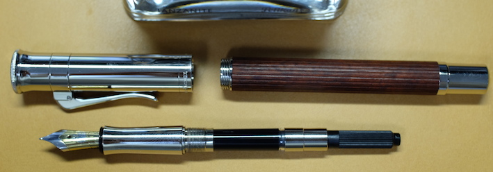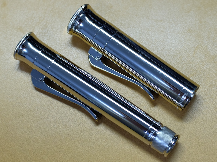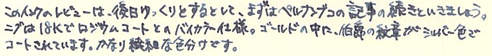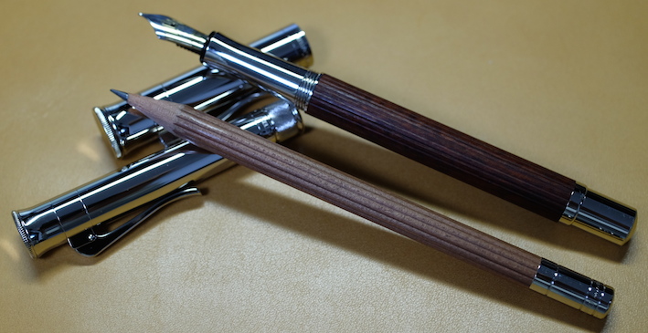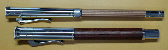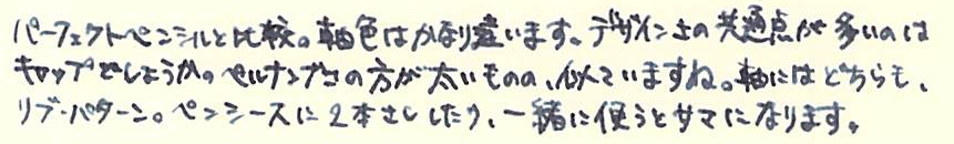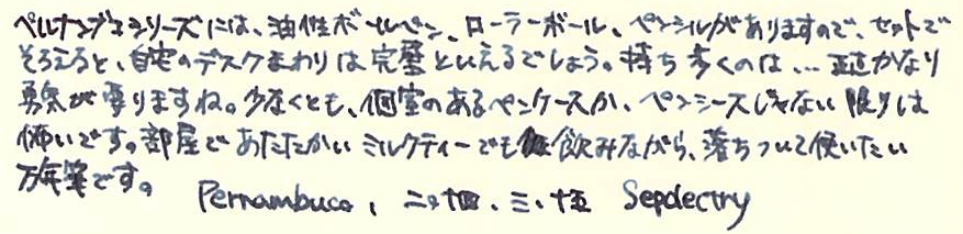 レビュー:GRAF VON FABER-CASTELL Pernambuco その2 Category:筆記具 Date:2014年03月15日 ということで、ペルナンブコ第二編のはじまりです。 今夜は、おなじく伯爵コレクションのパーフェクトペンシルとの比較を メインに据えてやっていきたいと思います。 昨日とインクが違いますね。なんだかんだでガーネットレッドから変えてしまいました。 伯爵コレクションにもコバルトブルーがあるのですが、鮮やかな青色と言った感じ。 前シリーズのロイヤルブルーをちょっと濃くしたような感じみたいで、 わたしのイメージとは違っていたので、今回は見送りに。 変わりに、ペリカンのエーデルシュタインから、タンザナイトを選択しました。 ペンポイント部分からニブの中盤に掛けてがロジウムコート(銀色)、 そこからニブの軸が金色(18K)なのですが、伯爵の紋章だけが これまたロジウムコート仕上げになっています。 大変美しいのですが、職人泣かせのデザインだなぁ。 手に入るならEFがいいんですけどね。 ファーバーカステルのエモーションシリーズやアンビションシリーズは 変えニブが売っていて交換できるのですが、伯爵コレクションには無いだろうなぁ。 というよりも、ヨーロッパタイプのカートリッジ・コンバータ両用式万年筆には 現状、ほぼすべてペリカンコンバータを刺している状態です。 ここで3300円出して専用コンバータを買うか買わないかで、 伯爵と小市民の差が出てしまうような気がします(笑 パーフェクトペンシルのリフィルはシダーで、こちらはペルナンブコなので 軸の色にはかなり差があります。現状、伯爵コレクションのラインナップには シダーはありませんので、パーフェクトペンシルとセット感を出したいなら、 リフィルを黒にして、万年筆をエボニーにすると良いかもしれません。 リフィルをペルナンブコで出してくれれば・・・とも考えたのですが、 もったいなくて血の涙を流しながら削る自分の姿が容易に想像できてしまいました。 伯爵コレクションにペンケースがあるのですが、あまり琴線に触れないんですよね。 今度自分で作ってみようかと思います。 PR