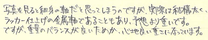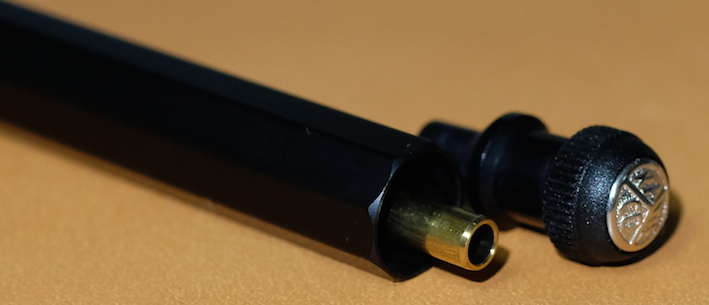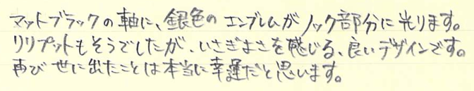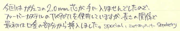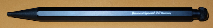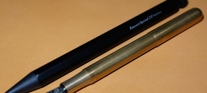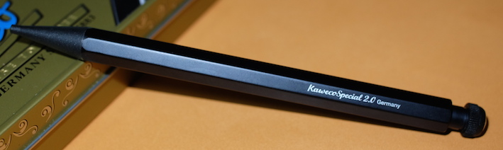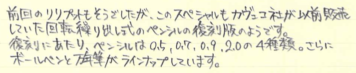 レビュー:Kaweco スペシャルペンシル 2.0 Category:筆記具 Date:2014年08月11日 カヴェコの筆記具はリリプットさんに引き続き二つ目になります。同社らしい八角軸のシリーズ、スペシャルの2.0mmペンシルです。カヴェコには2.0mm芯がサプライとしてあるにはあるのですが、かなり手に入りにくいため、他社の芯を使うのが現実的かと思います。現状はファーバーカステルの芯を使っていますが、特に問題は起きていません。とある通販サイトだとマルス芯をおすすめしていましたね。 2.0mmシャープペンシルというと、北星鉛筆の「大人の鉛筆」が手に入りやすいですね。自由落下式の芯ホルダーとは似て非なる製品ですが、結局は個々人の好きずきでしょうか。 ノック部分のローレットが、このカヴェコ・スペシャルが回転繰出し式だったときの名残だと思います。復刻されるにあたり、通常のノック式に変更されています。 直径は丁度1.0cmですので、わたしはこれを「細軸」とは思っていません。通販サイトの写真ではかなり細長く見えるのですが、実際は結構ずんぐりしています。 エンブレムはKAWECOの6文字を二つずつ円に収めたようなもので、なかなかかわいらしいです。カヴェコには万年筆インクが使えるインクローラーもあったり、魅力的な商品展開をしていますので今後とも注目のブランドです。 簡易芯削機などはついていませんので、2.0mm芯用の芯削機を持ち運ぶことになると思います。上の画像は同社のリリプットと。方向性は違いますが、シンプルなデザインが良いですね。 PR