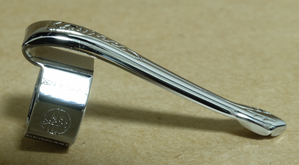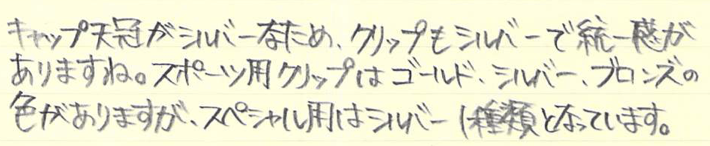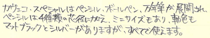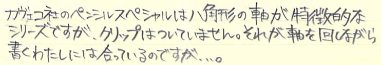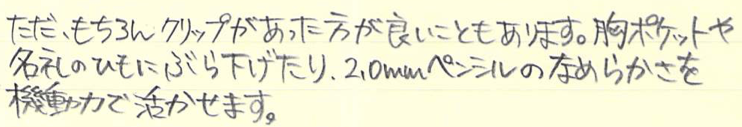 レビュー:Kaweco スペシャル用クリップ Category:筆記具 Date:2015年11月05日 カヴェコ社は専用ケースやアクセサリー、替えニブなど、多種多様なアクセサリも大きな魅力のひとつですが、今回はスペシャル用のクリップを購入してみました。鉛筆をイメージした、握りやすい八角形の軸は重心のバランスの良さも相まって、非常に筆記しやすいのですが、クリップはありません。カヴェコの筆記具はスポーツやスペシャル、リリプットなど、クリップのないものが多い気もします。ペンシルスペシャルのミニサイズモデルにクリップをつけて、首からさげても可愛い気がします。 ペンシルの芯径が非常に豊富なのもこのペンシルスペシャルの特徴。1.18mmも出ないかな・・・。もちろん、このクリップは万年筆やボールペンでも使えます。シルバー色なので、シルバー軸にもばっちり合いそうですね。 天冠ノック部のカヴェコのロゴマークとクリップがよくマッチしていますね。クリップにも同じく、Kawecoの文字とロゴマークが刻印されています。 軸を金属でホールドするだけのある意味原始的なクリップですので、ホールドする部分がゆるくなってしまうと使い物にならなくなるので、気をつけながら装着しましょう。手軽に愛用の筆記具の印象を変えられるカヴェコのクリップ、おすすめです。 PR