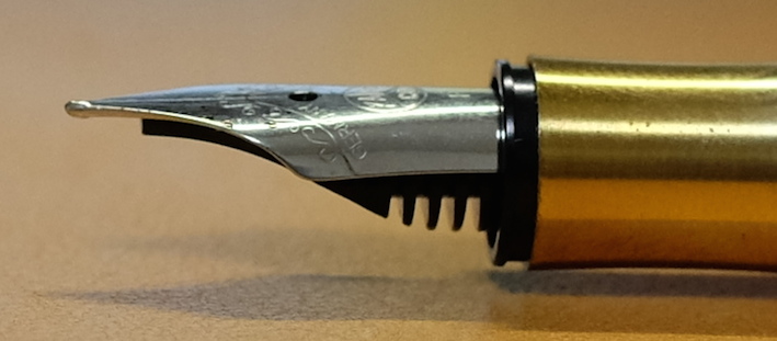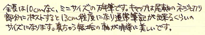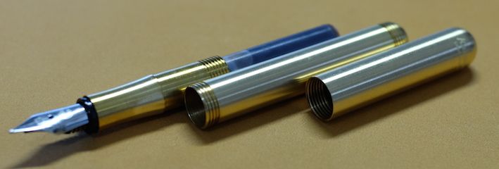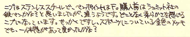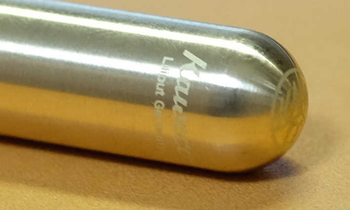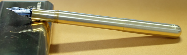 レビュー:Kaweco リリプット 万年筆 ブラス F Category:筆記具 Date:2014年07月11日 やはり真鍮が好きなのです。意外と珍しい真鍮軸の万年筆、カヴェコのリリプット。 インペリアルブラスのペンケースはピッカピカの鏡面仕上げなのに対して、リリプットはヘアライン仕上げですね。 Gutberler Gmbh社による復刻版のようですね。ブガッティの名前をフォルクスワーゲンが購入してヴェイロンに使っているようなものでしょうか。(わかりにくい) クラシックスポーツは万年筆のみならず、インクローラーも出ていたりして大変に魅力的です。別売りのクリップをつけて使うのもいいですよねぇ。 ねじ切り部分の拡大。こういう機構は真鍮の最も得意とするところですね。加工精度も素晴らしく、スルスルとキャップが収まります。うーん、美しい。 ニブはシュミットの鉄ペンよりもサイズが小さいですね。ペンポイントは細く研いであります。ペン芯にもニブにもカヴェコ社のマークが入っており、自社開発のニブなのかな? インクは気になっていたカヴェコのセピア。エルバンなどの小型ヨーロッパタイプなら問題なく使用できそうです。真鍮無垢の味わいを楽しみながら使っていきたいです。 PR