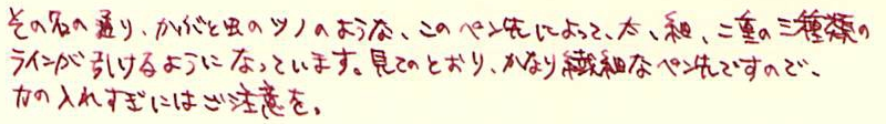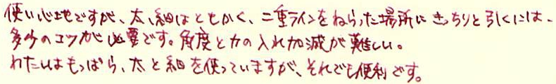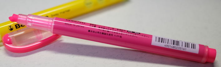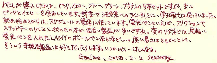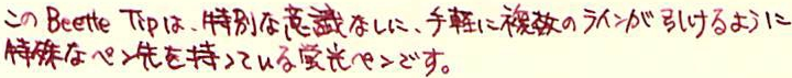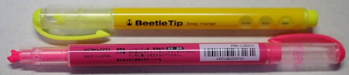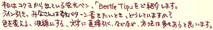レビュー:KOKUYO Beetle Tip Category:筆記具 Date:2014年03月03日 今や蛍光ペンは日本の学生の必需品ですね。蛍光ペンの出始めのころは 確かに暗闇で光ってた気がしたのですが、最近のはあまり感じません。 うーん、気のせいなのかな?こんばんわ、sepdectryです。 太いラインは文字にかぶせて、細いラインは文字の下に・・・など 蛍光ペンのラインの太さを変えたいときは結構ありますよね。 こんな感じです。 筆圧の強い人って、フエルトペンのペン先を潰してしまいがちですよね。 かくいうわたしも、ダブルマーカーの蛍光ペンの細い方を何度も潰してしまったことがあります。 細いラインのみを引きたいのに、二重ラインになってしまったり、 二重ラインを引きたいのに、細いラインのみになってしまったりが結構あります。 この辺は純粋に慣れですね。ペン先の角度や方向など。 特に使用例のような、きれいに太さの揃った二重ラインを引くのはかなり難しいです。 書いてから気づいたのですが、ブラウンじゃなくオレンジでした。御詫びして訂正します。 ステッドラーの蛍光マーカーはかなり気になってます。クレヨンみたいな書き味だそうで。 Beetle Tipのインクがそろそろ切れそうなので、次はこれを買ってみようと思います。 PR