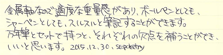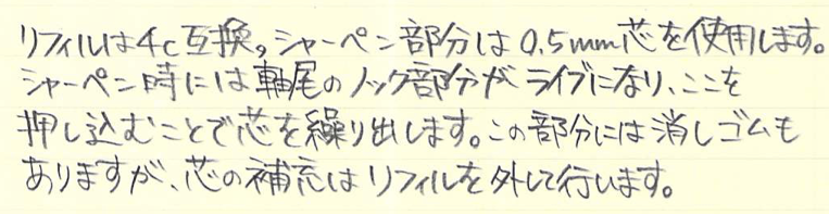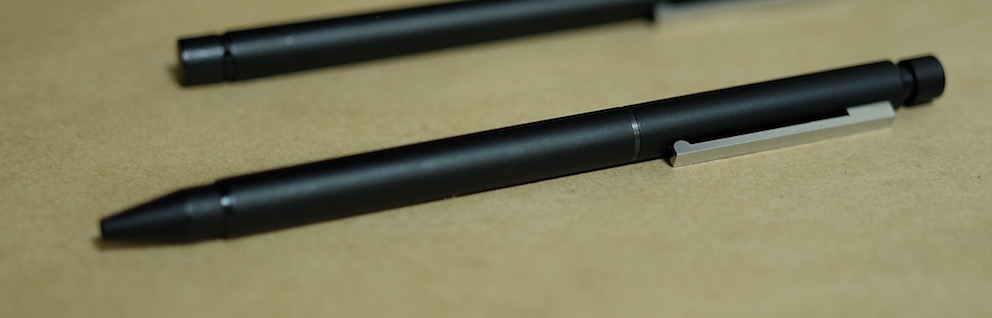 レビュー:LAMY ツインペンcp1 マットブラック Category:筆記具 Date:2015年12月30日 本年も残すところあとわずかになってしまいましたね。2016年につきましても、皆様に楽しんでいただけたらと思います。がんばります。 おそらく今年中の更新はこれで最後になるかと思うのですが、やはり大好きなラミーの製品にいたしました。cp1ツインペンになります。 サファリのツインペンはすでに廃盤になっており、ちまたではかなりのプレミアがついているようですよ。現在はst、ロゴ、cp1のような細身の軸のものに設定されていますね。 マルチペンはいつも、2000の4色のものを使用しているのですが、このcp1は0.5mmのシャーペンリフィルが使えるのがポイントだと思います。細軸のcp1のイメージを崩さないようにマルチペン化しているのはさすが。 画像がブレていて申し訳ないのですが、円錐形に細くなっていく先端から、ボールペンとシャーペンリフィルのペン先が顔を出しています。先端からペン先へのつながりがシャープな感じで気に入っています。 ボールペンの機動力、消しゴムで消せるシャーペンと万年筆のすらすらさが、最小限の本数で揃えられるのが、マルチペンと万年筆の組み合わせの魅力。ぜひ二本持ちをおすすめします。 PR