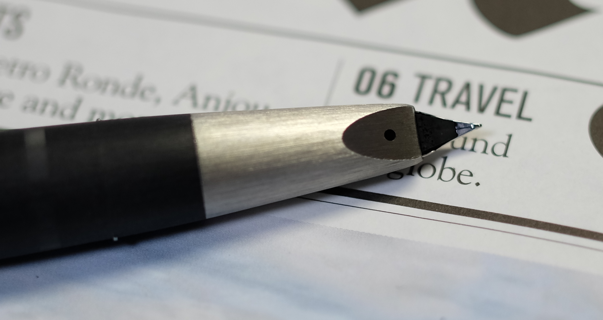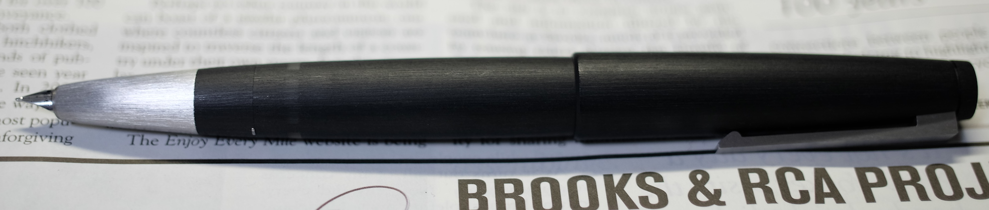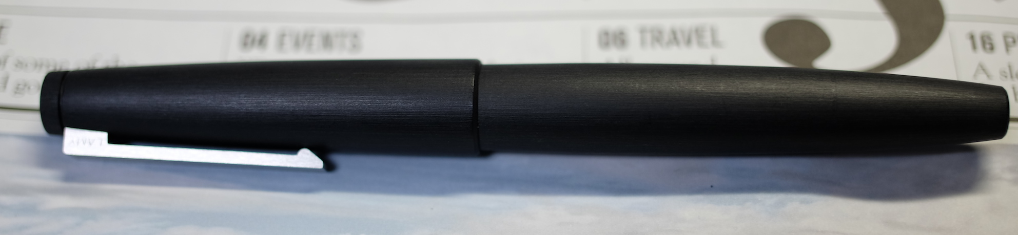 レビュー:LAMY 2000 Category:筆記具 Date:2014年01月31日 LAMYも2本目、2000のレビューに参りましょう。 軸はレジン樹脂をヘアライン加工風に削り出したもの、 ペン先はヘアライン加工のステンレス。個人的には最高のマッチングです。 ペン先前にはインク窓がありますが、ちょうどこの万年筆で筆記していると 指で隠れてしまうようになっています。おそらくそのようにデザインしたんでしょう。 通常、万年筆にはそのメーカーのインクを入れるようにしているのですが この2000だけは、軸のイメージに合わせたこのインクを使っています。 うーん、「竹炭」でもよかったかな。軸がそっくりだし。 写真は吸引穴。以前のモデルはここからインク漏れがあったらしいのですが、 ペン先がステンレス一体型になって改善されているようです。 発売から40年以上経ったモデルでも改良されているところに、LAMY社の本気を感じます。 次の機会に、マルチペン、ペンシルもレビューしようと思います。 ローラーボールは・・・マルチペン持ってるし、どうしようかな。 PR