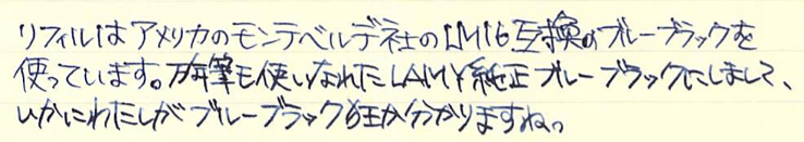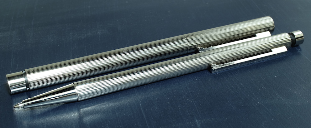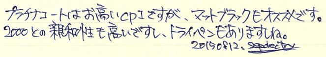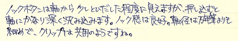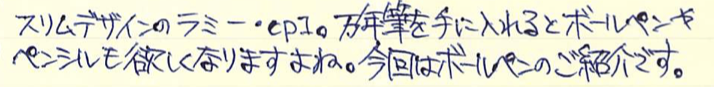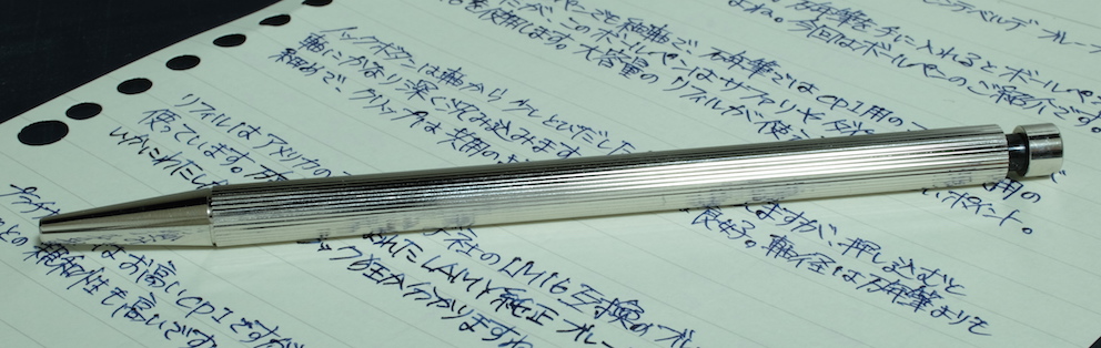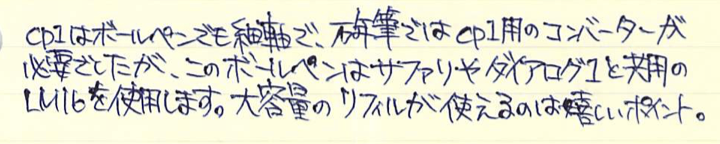 レビュー:LAMY cp1 ボールペン Category:筆記具 Date:2015年08月13日 cp1はセットで・・・というどころか、マットブラックまで欲しくなってしまいます。マットブラックに14kニブの万年筆が出ないかなー。ということで、プラチナコーティングのボールペンです。ペンシル、ローラーボールもありますが万年筆に続いてはボールペンということで・・・。プラチナコーティングにストライプパターンの美しい細軸なのはボールペンも同じ。 ちなみに、4cリフィルをLM16で使えるようにするアダプターは、なぜかこのcp1では使用できませんでした。使えるのはLM16かモンテベルデの互換リフィルのみですね。 ラミー2000は共用のように見えて、クリップは別規格だったのですが、このcp1は共用パーツになっているようですね。裏にはいつものようにGERMANY。 このモンテベルデのLM16互換はもっと愛用者が増えていいのではないでしょうか。色のバリエーションも豊富ですし、軽く書きやすいですよ。 マットブラックなら2000と一緒に持っても何の違和感もないと思いますので、トライペンなんかと2000を一緒に使うのもいいかもしれませんね。 PR