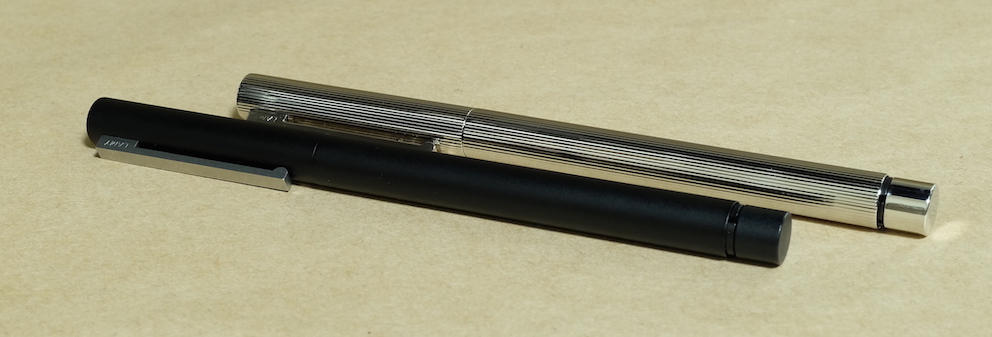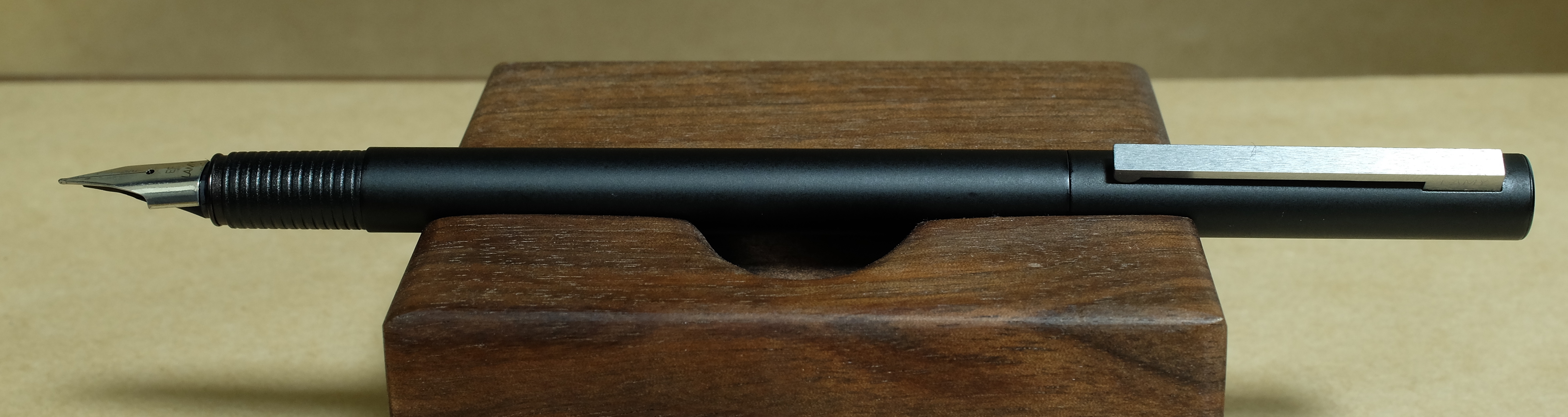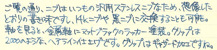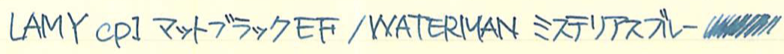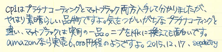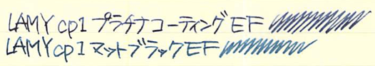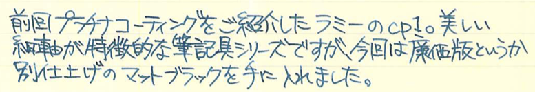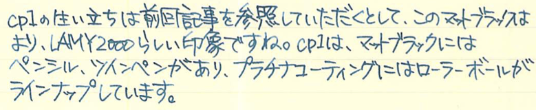 レビュー:LAMY cp1 マットブラック Category:筆記具 Date:2015年12月17日 同型の記事はこちら レビュー:LAMY cp1 プラチナコーティングの記事でも書きましたように、欲しかったマットブラックを入手しました。思っていた以上に美しい万年筆です。 これをプラチナコーティングの廉価版と侮るなかれ、全く別の仕上げをした別バージョンと言ったほうが正しいと思います。豪華できらびやかなプラチナコーティングとは異なり、スマートで都会的な印象ですね。 トライペンにもcp1モチーフのものがあり、チタンコーティングとこのマットブラックがあるようなので、セットで持ちたい人にはこちらもおすすめ。 プラチナコーティングとは細かい違いもあり、このグリップ部分はプラチナコーティングがつるんとしたグリップなのと比べ、マットブラックはギャザード加工。こちらのほうが持ちやすいですが、美しいのはプラチナコーティングですかね。ちなみに旧cp1はシルバーコーティングでもこのギャザード加工のグリップでしたよ。 仕上げが違うと、結構印象が変わるものですね。ニブはプラチナコーティングが14k、マットブラックがステンレスになっています。それぞれの筆跡は上記の通り。 クリップは2000のものに似ていますね。ヘアライン仕上げのステンレス。しっかり横には「LAMY」の刻印。裏には「GERMANY」の文字が。こちらの2000と同じ意匠です。いざ買おうとなるとステンレスニブで実売6000円という価格がネックなのかあまり人気とは言い難いcp1ですが、使うと良さがわかります。 PR