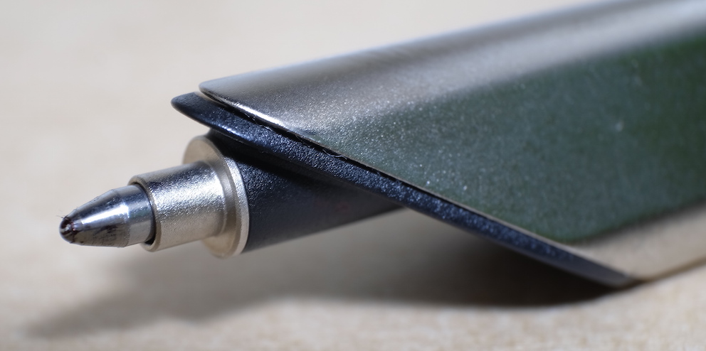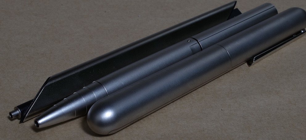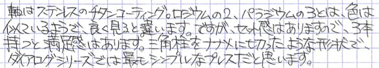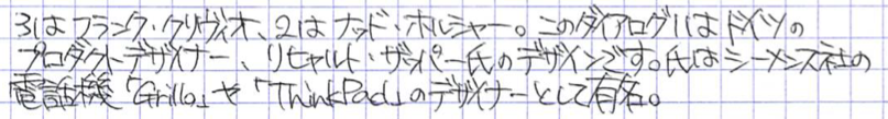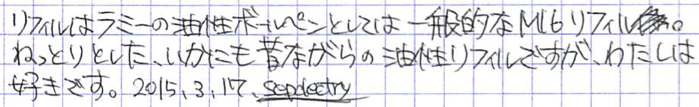 レビュー:LAMY dialog1 Category:筆記具 Date:2015年03月17日 近いうちに・・・と書きましたので、本当に近いうちにレビューしました。ラミーのダイアログ1です。なんとも楽しい油性ボールペンですね。ダイアログシリーズの沿革はもう語り尽くしてしまいましたので、さっさと中身に入りたいと思います。 万年筆の3、ローラーボールの2と来まして、残るは油性ボールペンの1。先日、テッシーの記事を書く際に「テッシーと似ている」と書いてしまいましたが、実際手に取ってみると、似て非なるものですね。 英語読みで、リチャード・ザッパーと読まれたりもします。テッシーのデザイナーであるマルコ・ザヌーソ氏の仕事仲間としても有名。二人でタッグを組んで、さまざまなプロダクトを世に送り出した、産業デザインの重鎮ですね。 色に親和性があるため、ダイアログ3はちょっとブラックは買いにくいですね。特にわたしのようにセットで持ちたい派の方には・・・。軸の形状は三角柱型のダイアログ1と楕円柱型のテッシーとで異なりますね。 このノック感が「シャリン」というような感じで、ノック音含めてとても気に入っています。ラミーの製品はこういうところにも気を使っているので、とても魅力深いですね。 リフィルの交換はペン先部分のボタンを細いもので押し込んで行います。M16リフィルがところ狭しと詰まっているのがかわいらしいです。三角柱型なのでグリップ感もよく、程よい重さもあって、デザインだけでなく、書きやすい製品に仕上がっています。 PR