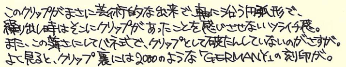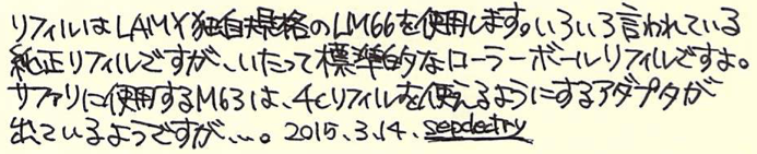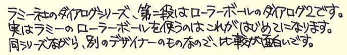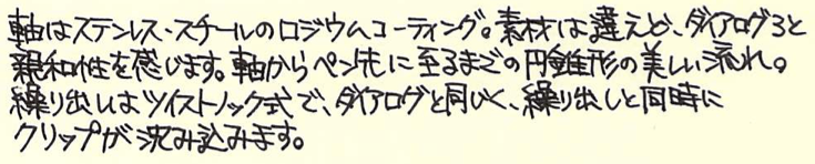 レビュー:LAMY dialog2 Category:筆記具 Date:2015年03月14日 製品ごとにことなるデザイナーを招聘して作られるラミーのダイアログ・シリーズ。今回はローラーボールのダイアログ2をご紹介いたします。実はわたしはローラーボールはあまり使わないため、ラミー2000やファーバーカステルのペルナンブコのように、ローラーボールのみを残して購入してしまうことが多々あります。 そんなわたしがこのダイアログ2の購入にいたったのは、テーゲー日記さまの記事を読んだから。とても魅力的な紹介で、ついつい購入してしまいました。 ナッド・ホルシャー氏はアルネ・ヤコブセンの一番弟子といっても過言ではない方で、デンマークを代表する建築家、プロダクトデザイナーのひとりです。ラミーの製品では、ピュアのデザインを担当していることでも有名。 ダイアログ3のカラーはパラジューム。こちら、ダイアログ2はロジウムコーティングですが、ダイアログ3のほうが若干の黄色味を感じるくらいで、色としては統一感を感じます。クリップもダイアログ3のような沈み込みのクリップ式。見てください、この軸との一体感。ある種の完成系だと言えるでしょうね。 クリップの先端にはリベットのようなモールドがあり、軸側のモールドと合うように軸をひねることでペン先が繰り出されます。繰り出しギミックにも、ダイアログ3との親和性が感じられますね。このクリップの裏にはラミー2000のように刻印が。こういうさりげないところに発見があるのが楽しいです。 LM66にはブラック、ブルー、レッド、グリーンのカラーバリエーションがあります。グリーンがあるのが面白いですね。ブルーブラックがあっても面白いと思うのですが。残るはダイアログ1のみとなったこのシリーズですが、近いうちに・・・。 PR