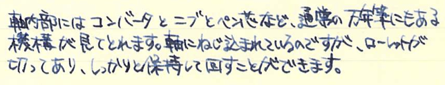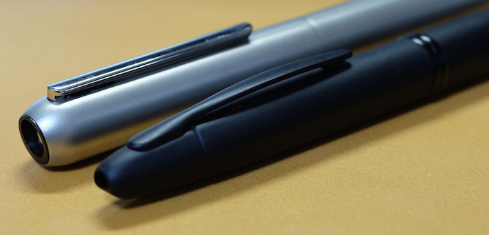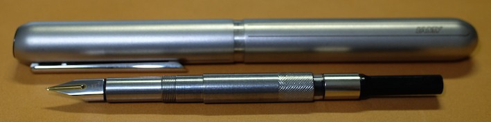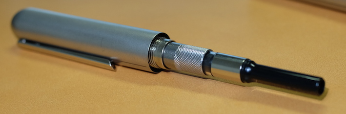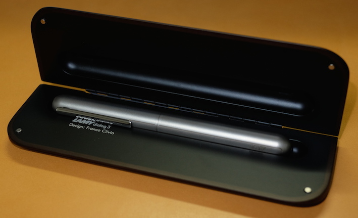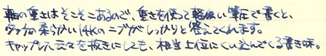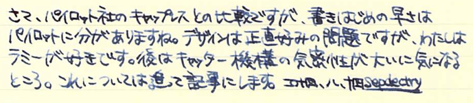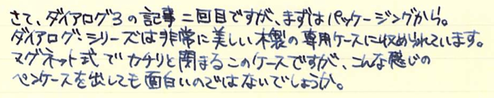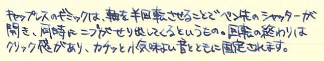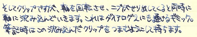 レビュー:LAMY dialog3 その2 Category:筆記具 Date:2014年08月14日 お盆休みになり、起きる時間が毎日30分ずつ遅くなっています。このままだとちょっとまずいので、明日は早起きしようかな。 これがもう、見事にダイアログ3しか収まらない専用ケースなんですよ。こういうのをあつらえるとラミーは素晴らしいですね。金属のひんやりとした万年筆なのに、この木製のケースが驚くほどイメージにあっています。 軸の真ん中の一本のラインがちょうど境目になっており、ここをツイストすることでニブがせりだし、筆記が可能になります。ニブを仕舞う際にも回転させるのですが、シャッターが完全に降りても尚、回転させることで軸を分解できます。 ここにローレットを切るあたりが本当にぬかりないと言いますか、さすがラミーですね。 ローレットをつまんでネジを外すとこうなります。パイロットのキャップレスも、こんな感じのユニットが軸の中にありましたね。 筆記時のクリップが邪魔にならないよう、クリップそのものを薄く作り、左右にくぼみを作り、つまみやすくしたパイロットに対して、ラミーの解決策がこれです。こんなギミックを盛り込みながらも、しっかりとバネ式のクリップにしてくるあたりがさすが。 しかし、たまーにインクのスキップが起こるんですよね。これはこの個体だけの欠陥なのか、ダイアログ3全体に見られるものなのかは分かりません。しばらく馴らして使ってみます。それでもダメならペンクリ行きですね。 パイロットのキャップレスは、モンブランのミッドナイトブルー(古典)を入れてもびくともせずに筆記が出来ますので、やはり気密性の面では信頼できますね。さて、ダイアログ3はどうでしょうか・・・。 PR