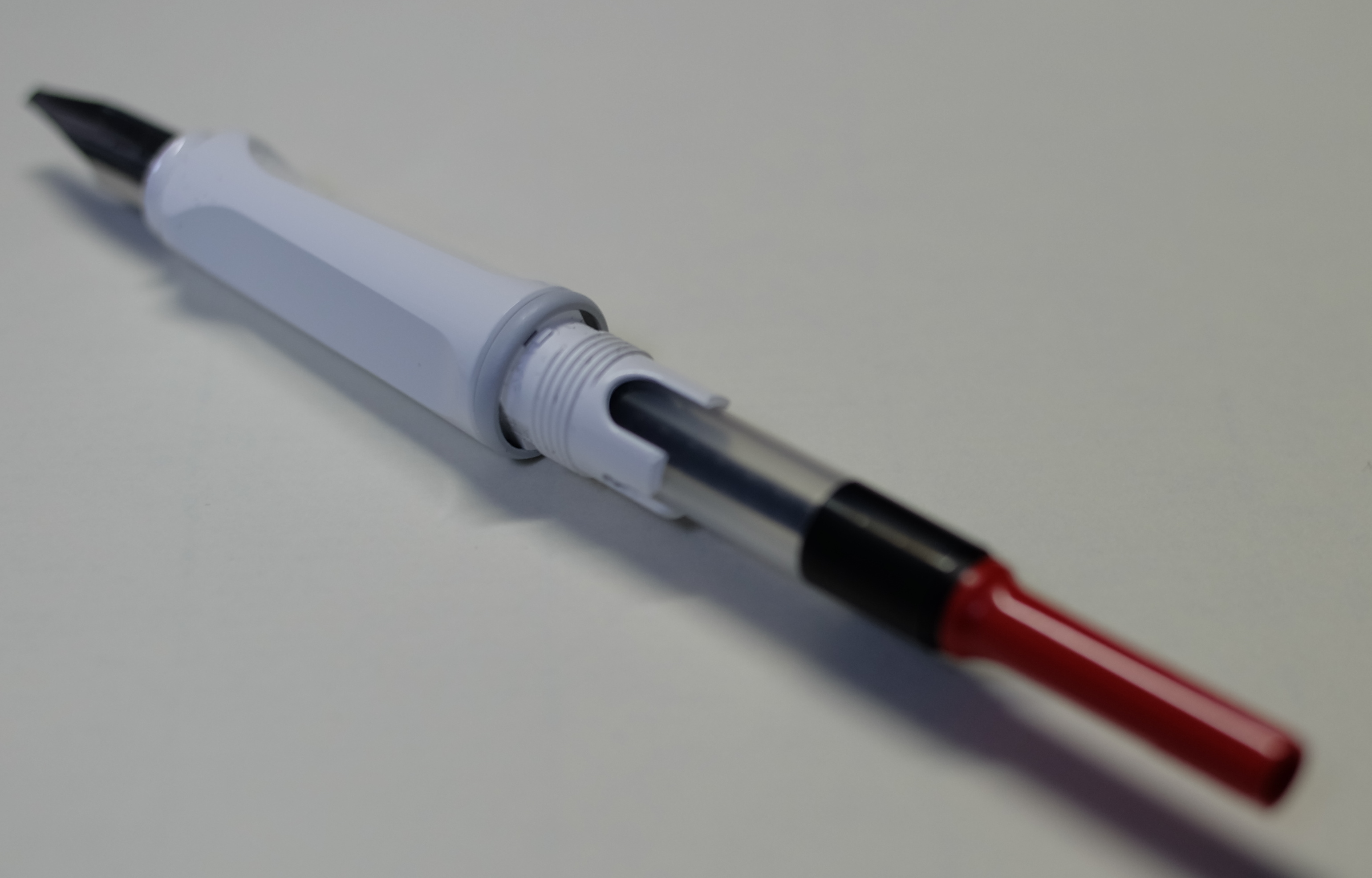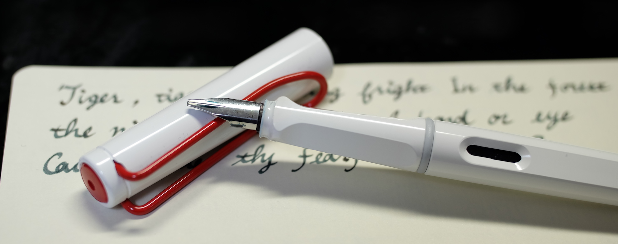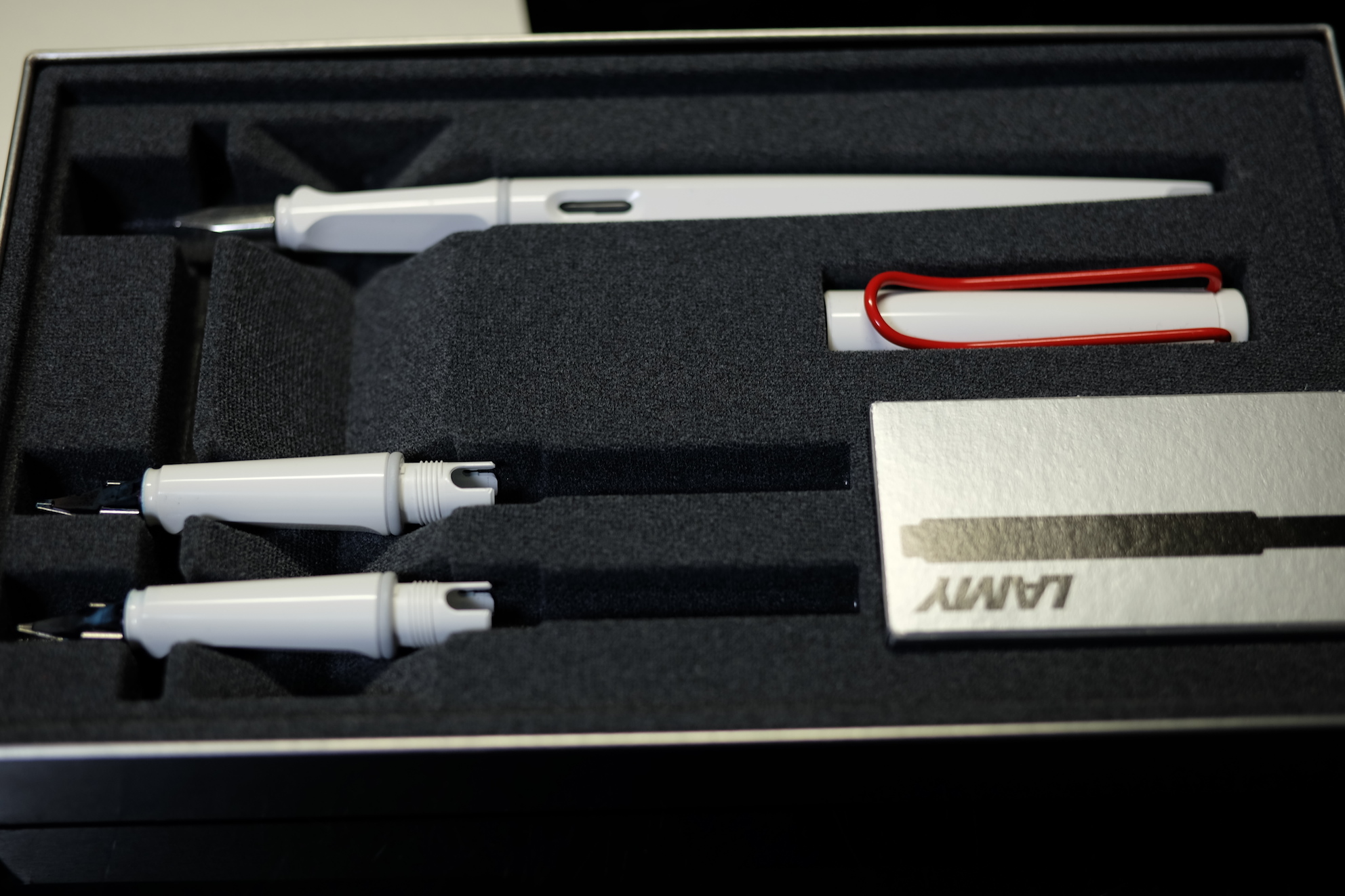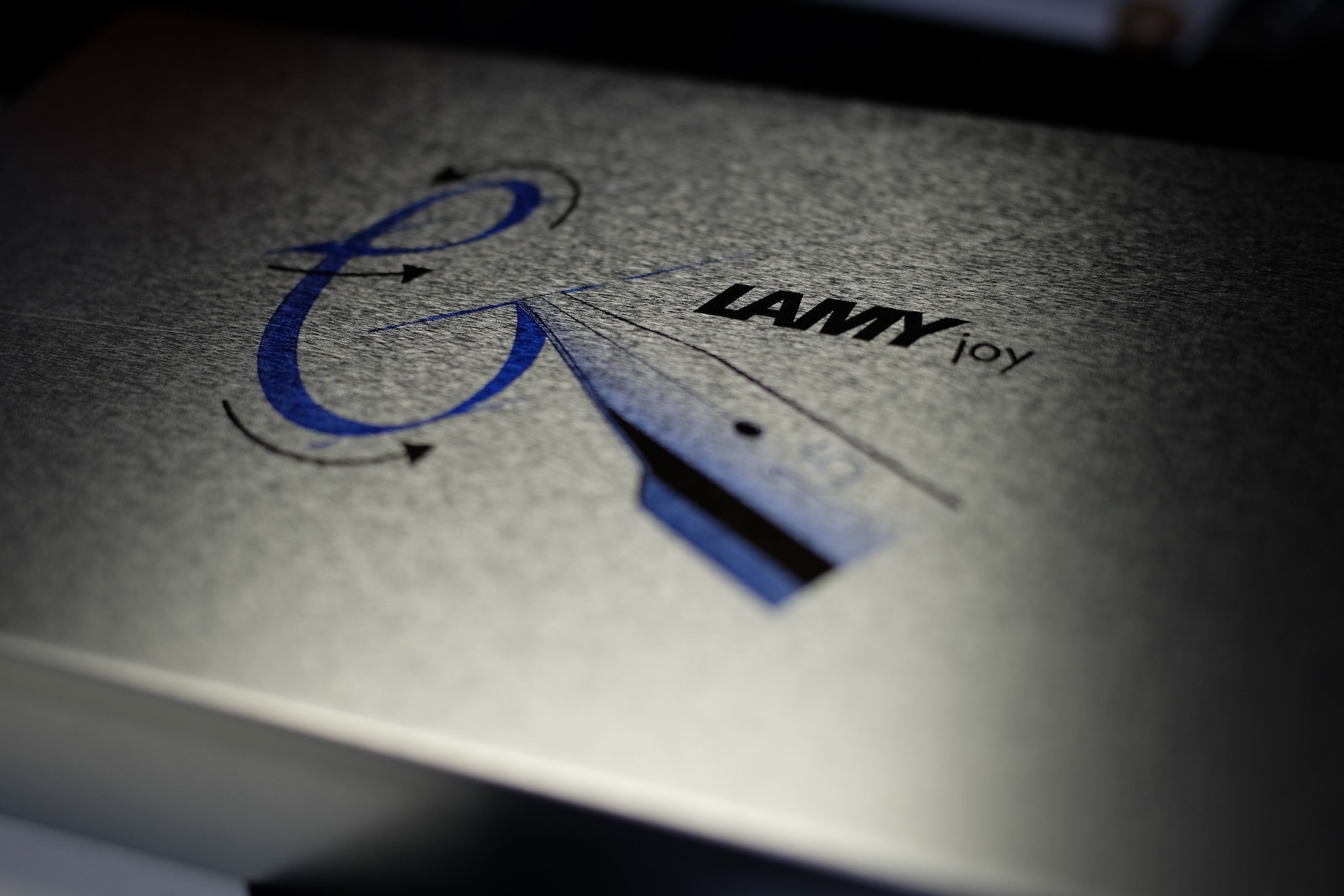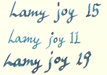 レビュー:LAMY joy Category:筆記具 Date:2014年01月28日 さて、このA Pinch of inkのタイトル画像ですが、これを何で書いたかというと、 この「LAMY joy」です。LAMY社についてはすでに何番煎じか分からないほど インターネット上に情報があふれています。 いわく、バウハウスの流れを受けつぐドイツの筆記具メーカーである。 バウハウスの生んだプロダクト・デザインの精神には感服させられて止まないのですが それについてはまた今度ということにして、このjoyのレビューに移りたいと思います。 LAMYの生んだカリグラフィー・ペン! さて、このLAMY joyですが、噛み砕いて言うと、「LAMY Safariのニブをカリグラフィーにしたもの」 ということになります。確かに軸はカリグラフィーの用途に合わせて延長されていますし、 どことなくデスクペンを彷彿とさせるフォルムになっておりますが、 それでもあの、LAMY Safari特有のデザイン・コンセプトはそのままです。 外観 まず、目を引くのがこの化粧箱。 どことなくクラシックな金属製のボックスに、イングリッシュ・カリグラフィーの モチーフがプリントされています。ボックスを空けてみると・・・ 整然と、三種類のペン先、インクボックス、キャップが並べられています。 インクはカートリッジで、ブラックが一箱、ブルーブラックが一本付属になっています。 ペン先は11mm 15mm 19mmと、万年筆の太さを表すf m bなどの表記はなく、 そのペン先で引ける最大の太さの幅が表記されています。 カートリッジインクのほかに、Safari用のコンバータを使用してインクを吸うこともできます。 私は主に、Pilot社の色彩雫シリーズ、月夜を入れて使っています。 各ペン先の太さはこんな感じです。11はカリグラフィーっぽさがあまりないですね。 逆に19までいくと、ロゴ・デザインに使えそうなくらいの太さ。 ちなみに私は15が一番のお気に入りで、遊び書きにもよく使っています。 ちなみに、おそらくこのカラーは日本限定の特別色だと思います。 このカラーのSafariも出ていますし、ペン先は互換がありますので、 付け替えて通常のSafariの軸にして、携帯性を高めて使ってみるのも 面白いかもしれませんね。 PR