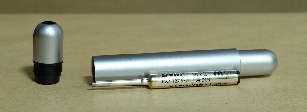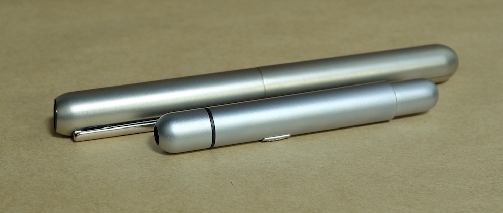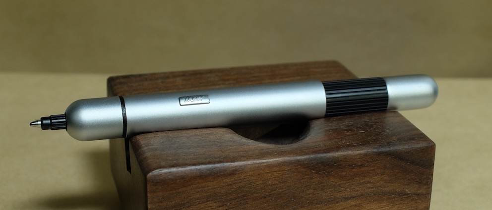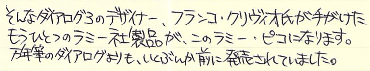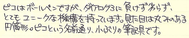レビュー:LAMY ピコ Category:筆記具 Date:2016年02月11日 あたたかい飲み物をのみながらこんばんわ。本日もたのしい筆記具のレビュー記事です。ラミー製品を紹介するたびにいかにわたしがラミー製品が好きかがわかるのですが、今回はキュートなボールペンをご紹介いたします。 そもそもキャップレス万年筆そのものがとてもニッチな製品なのですが、そんな中、ラミーが2009年に発売し話題になったのがダイアログ3。 市場に驚きをもって迎えられたダイアログ3でしたが、その発表前からフランコ・クリヴィオ氏がデザインし、ラミーから発売されていたのがこのピコです。 フランコ・クリヴィオ氏がギミッキーな機構を好んでデザインしたのかはわかりませんが、この二本はいずれもとてもユニークです。一見、小ぶりな金属の筒ですが…。 ダイアログ3は軸をひねるとニブが顔を出すとともに、クリップが軸に沈み込むという男心をくすぐるギミックでしたが、こちらのピコはノックするとペン先が顔を出すとともに軸の後ろ側が伸びます。これで筆記可能な長さになるというわけ。 さて、こうなるとやはり、見た目にも共通点の多いダイアログ3と使いたいのですが、この二本、実は軸色に多少の差異があります。セット感を出したいという方は、両方ブラックを買うのが良いでしょう。 PR