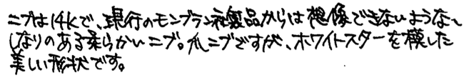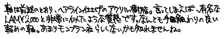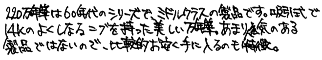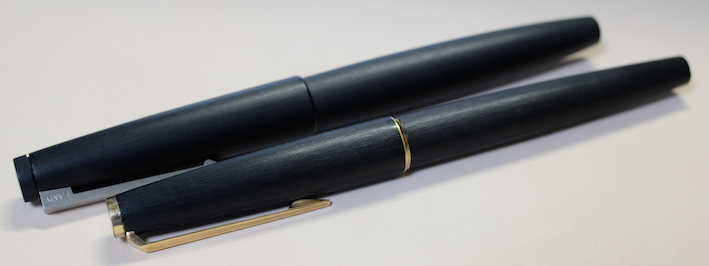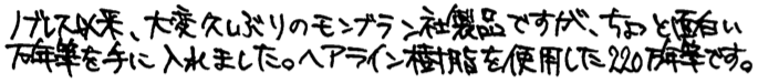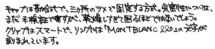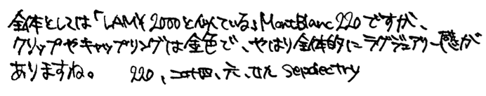 レビュー:MONTBLANC 220 Category:筆記具 Date:2014年06月29日 ペリカンと並んで万年筆の王道と言えばモンブランですが、わたしはあまりモンブラン社の製品を持っていません。ノブレスと古典ミッドナイトブルーくらいだったのですが、しなりのあるノブレスの書き味はとても気に入っていました。 どうやら、ビンテージモンブランのなかにはノブレスのように弾力性のあるしなるニブを持つ製品が多々あるとのことで、安く入手できないものかと探していました。 モンブラン社製品といえば、磨き込まれた黒色の樹脂というイメージですが、こちらはヘアライン仕上げの樹脂という、一風変わった素材で作られています。 ユーズド品なら、どんなに高くても一万円はしないでしょう。わたしも5000円ほどで手に入れました。最近はオークションにモンブランの偽物が出回っているようで、そこは注意が必要ですが。 まるで質の良い備長炭のような、さらさらとした手触りの美しい樹脂。ラミー2000と似ていますが、あちらはマクロロン樹脂を使っていたはずなので、もしかしたら同じ素材なのかも知れません。 俗に言う「ヌラヌラ」な書き味よりも、弾力性としなりのある細字が好きなわたしですので、モンブランは現行品よりもビンテージの方が合っていますね。220もクラシカルな形状の首軸とニブですが、大変弾力性に富んだ素晴らしい書き味になっています。 60年代の製品、ということは製造されて半世紀ほどが経過しているということですが、古くささを感じさせませんし、ちゃんと筆記できるのはさすがモンブランといったところ。このころのモンブランに唯一問題があるとすれば、尾軸のホワイトスターの外れやすさでしょうか。 ラミー2000は66年の発売ですから、ちょうど時期のかぶっていた製品ということになります。70年代になると一気に細軸の時代になりますが、やはりプロダクトデザインには流行があるんですね。ラミーとモンブランは同じドイツのメーカーですが、ある意味対極に位置していると思います。この二つが似ているのは偶然なのでしょうか。それとも・・・。 PR