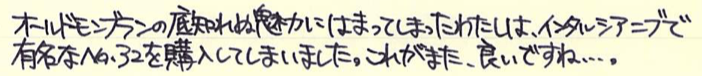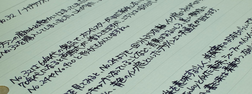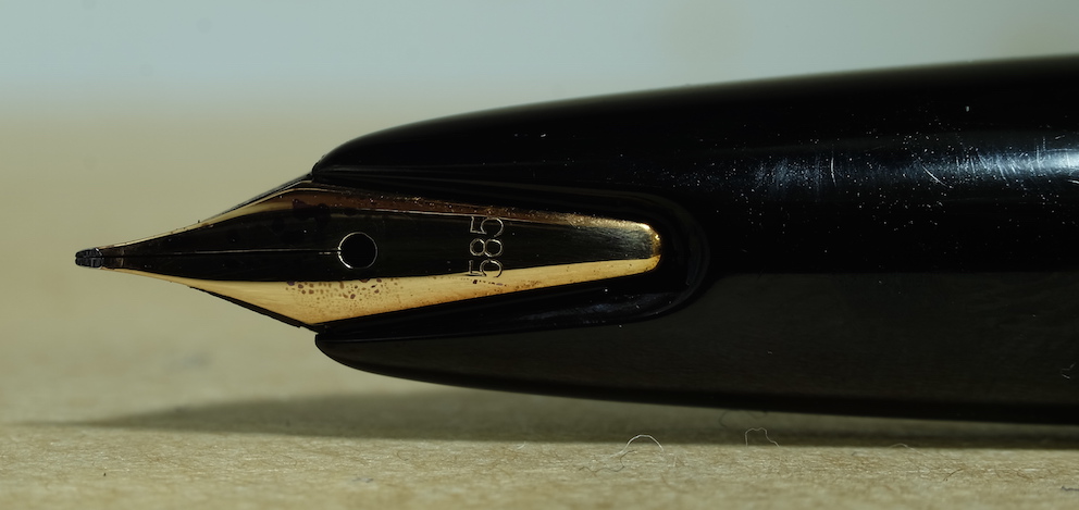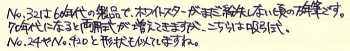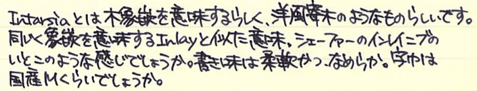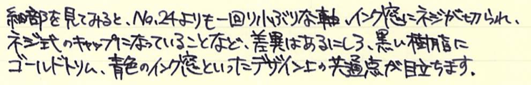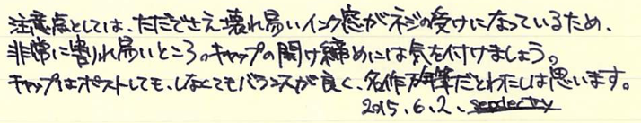 レビュー:MONTBLANC 32 Category:筆記具 Date:2015年06月02日 オールドモンブランは本当に個性的なニブをしていますよね。愛好家が多いのも頷けます。モンブランにはモンブランのインクを基本的に入れているのですが、久しぶりにナガサワオリジナルの多聞パープルグレーを入れてみました。このくらいの字巾だと、またちょっと違った印象ですね。 軸は特に面白みのない仏壇カラーなのですが、ニブが本当に個性的です。 ホワイトスターは天完と軸尾に完全に埋め込まれており、紛失のしようがありません。軸の形状は同時代のモンブラン製品にとてもよく似ています。 このNo.32はちょっと小ぶりのレディースサイズで、モンブランの中でも廉価版であり、インク窓に金属パーツはありません。実用重視といったところでしょうね。 特徴的なインタルシア・ニブは、爪ニブとはまたちょっと違う独特のニブで、まさに象嵌のように、樹脂に金属がはめ込まれたような見た目。こちらは585ということで14kのニブです。420よりは柔らかいですが、24よりは固めという絶妙の柔らかさ。 この角度からの写真は、本当にシェーファーのインレイニブに似ています。書き味は似て非なるもので、完全なるガチニブで独特のフワフワ感のあるインレイニブと、ある程度しなりのあるインタルシアニブ。とっても面白い万年筆です。 PR