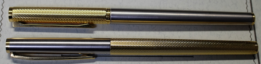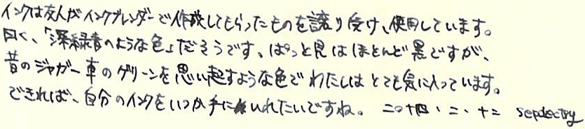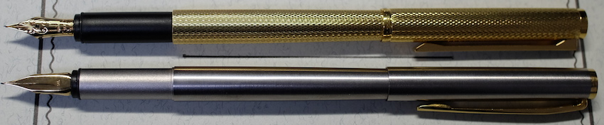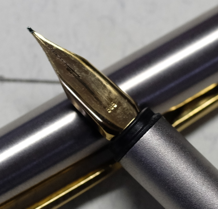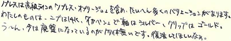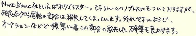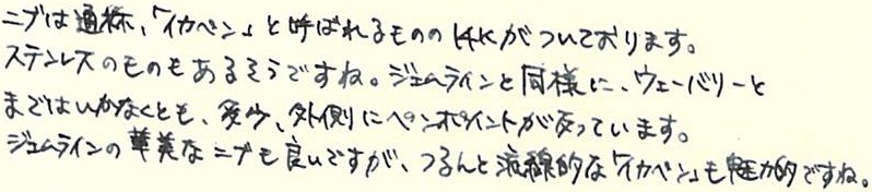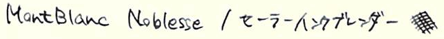 レビュー:MONTBLANC Noblesse シルバー Category:筆記具 Date:2014年02月12日 どこもそうだと思いますが、年度末は仕事が忙しいです。 残業代でなんか買ってやろうという気持ちをモチベーションにして なんとかがんばっています。こんばんわ、sepdectryです。 モンブラン社のノブレスを入手しましたのでご紹介します。 この通り。これをすることの是非はともかくとして、可能ではあります。 ねじ切りの径も一緒ですので、ペン先を思い切って交換して・・・ こんな状態にも(笑 やっぱりどことなく違和感がありますね。 ニブはこんな感じです。ちょっとスリットが詰まり気味。 「イカペン」とは言い得たりといった感じですね。 ねじ込まれているだけなので、緩くなって抜け落ちてしまうことがよくあるみたいです。 最近のモンブラン社のものは改善されたのかな? ジェムラインとの比較。こうしてみると本当にそっくりです。 装飾とニブの違いでここまで印象に差が出るんですね。 ノブレスも時代が下るにつれて、イカペンではなく通常のオープン・ニブのモデルも あったらしいです。それはこのジェムラインと同じ形、大きさのはず。 ノブレス・オブリージュは「富めるものの責務」とでも訳しましょうか。 騎士道的貴族精神を表した言葉として有名ですね。 インクブレンダーのネタは考えてあるのですが、どうもわたしの行動圏内に 来ていただけないんですよね。チャンスがあれば是非行きたいです。 PR