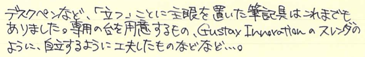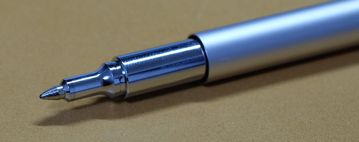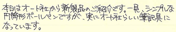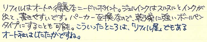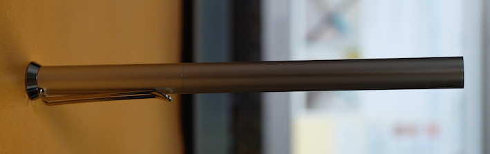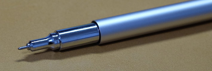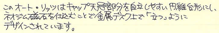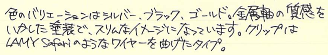 レビュー:OHTO リッツ(LITZ) Category:筆記具 Date:2014年11月05日 もうわたしの地元は霜が降りるようになりました。いかが御過ごしでしょうか。珍しく新製品(?)のレビューです。今年の夏に発表されたオートのボールペン、リッツ。 タッシェやポッシュもそうですが、オートは円筒形筆記具を多数リリースしていますね。アウロラのアスティルが大好物なわたしにとっては注目のメーカーです。 スレンダは非常に面白いですね。斜めに自立するのは良いのですが、筆記角度によっては書けないのではないかと思ってしまいます。 奇しくも、クラシックデザインの伯爵コレクションのキャップのように、末広がりの天冠になっているのが面白いです。クラシックコレクションもおそらく、キャップをテーブルの上に立てて、ポストせずに筆記するのを念頭に置いていたのだと思います。円筒形デザインにはアルマイト処理がよく合いますね。シルバーもそうですが、ブラック、ゴールドもクールな感じになっていました。 0.5という太さのリフィルが付属しているのですが、他メーカーの0.5より明らかに細い気がします。ニードルポイントとジェルインクが相まって、細かい文字をスルスルと綴ることができます。 このとおり、パーカー互換のリフィルにすることもできます。くびれのある口金デザインなので、リフィルを入れ替えても違和感がありません。ボールペンリフィルを入れ、キャップは常にポストした状態にして、壁にくっつけておくのも素早く筆記出来ていいかも知れませんね。 PR