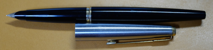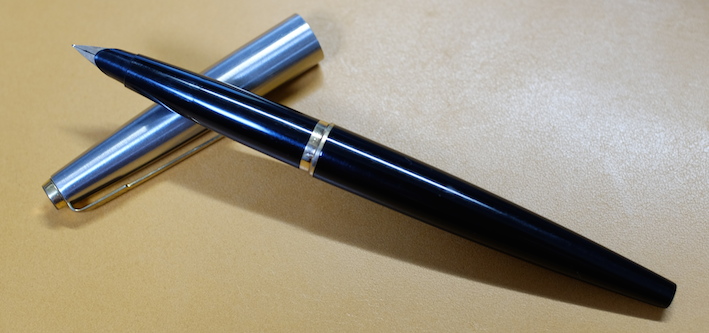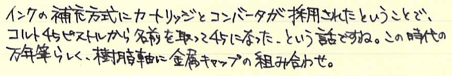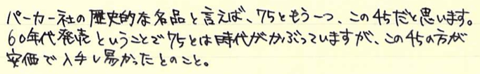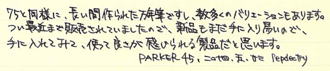 レビュー:PARKER 45 万年筆 フライターキャップ Category:筆記具 Date:2014年05月23日 なにやらパーカー祭りでもやっているかのような頻度ですが、本日もパーカー製品です。5thとはうってかわって、レトロな45万年筆のご紹介です。 パーカー社の万年筆というと、想像されるのがこの45だという方はきっと多いでしょうね。 75はちょっと学生身分には厳しい価格設定ですが、この45なら・・・という時代背景だったという話をよく耳にします。安価とはいえ金ペンですので、良い時代だったんだなー。 45ピストルというとなんだかよく分かりませんが、要するにM1911のことでしょうか。45口径弾を発射するオートマチックピストルです。マガジン式で給弾が容易だった点からこのパーカー45の名前が取られたのでしょうね。 他にもステンレスニブや18Kニブのモデルがあったりするらしいです。ここまで硬いとステンレスでも変わりないんじゃないかと思ってしまいます。 ゴムサック式コンバータは実は初めて使用したのですが、結構面白いですね。小気味良い音とともにインクを吸引するのが癖になります。インク残量は見づらいですが・・・。 極細をXと表記している点からも、かなり古い製品のような気がします。ちなみに45は2000年代後半まではカタログに載っていて、新品が販売されていました。2007年に惜しまれつつ廃盤になったらしいです。 樹脂軸+フライターキャップモデルだけ取っても、色、ニブ等々さまざまなバリエーションがありまして、とてもとても網羅はできないです。オークションで「こんなの見たこと無い!」という45が出てくるのも頷けますね。 PR