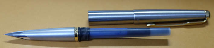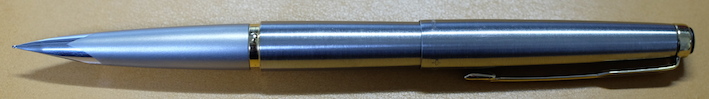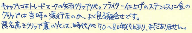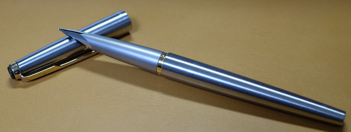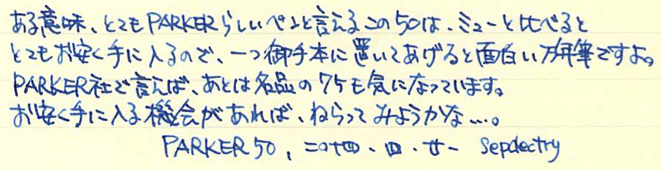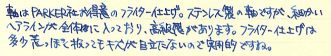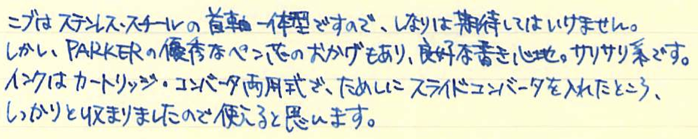 レビュー:PARKER 50 Falcon フライター Category:筆記具 Date:2014年04月21日 定番から外れた製品をみたとき、なんだこりゃ?と思うか、面白い!と思うかは人それぞれですが、わたしは後者で、試してみたくなります。レビュワー向きの性格ですかね。 うーん・・・なんともいえんですな、この流線型の軸。本日ご紹介するのはパーカー社の50。別名、ファルコンという万年筆です。 この50は1970から80年代の万年筆で、レトロモダンなデザインですね。航空機をモチーフにして作られたという流線型は大変美しいです。 ミュー、ミューレックス、ミュー90などは、キャップを閉めた状態でもん?と感じるものがありますが、このパーカー50は普段は至って普通。キャップを外すとなんじゃこりゃ!?状態です。特徴は首軸一体型ニブ。軸がそのままのびてニブになっています。なんとも美しいニブですが、首軸が前の方にある分、ミューよりは徹底出来てないかな。わたしの母が随分使い古したジョッターのボールペンを使っているのですが、フライターの軸は本当に傷が目立ちません。ステンレスの堅牢性がそのままデザインになったような、素晴らしい仕上げだと思います。 このように、数十年前の製品でも現行のコンバータが使えるのは素晴らしいですね。この50が作られていた頃はパーカーがメイド・イン・USAの頃で、合理化の国の発想でしょうか。首軸からニブにかけてはフライター仕上げが入っていないのは書き味に影響が出るからでしょうか。ここもフライター仕上げにすればさらにデザイン上の良さを強調出来ると思うのですが。 本当に、あの謎の穴は何なんでしょうかね。ベクターにも空いているのですが。一説では、キャップを幼児が誤飲した際に窒息しないように・・・とか。また、勘合式のキャップで気密性を高めすぎると、外したときにインク漏れが起きてしまうのでその防止策に・・・とか。後者ですかね。 堅実なようで、たまに暴走してとんでもないものを作ってしまうのがパーカーというメーカーで、それが良いところでもあったりします。この50はその好例でしょうか。後はパーカー180など・・・。近年では5thがその枠に入ってしまうのか、それとも定着するのか。かなり改良の余地がありますね、あの製品も・・・。 PR