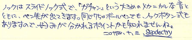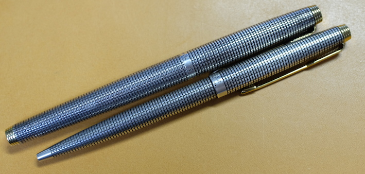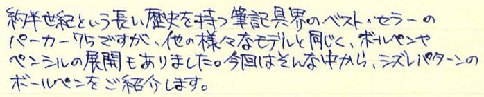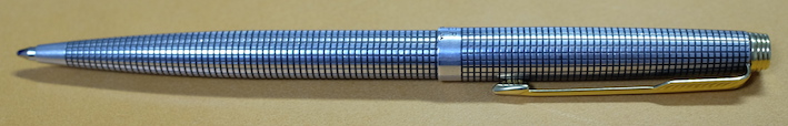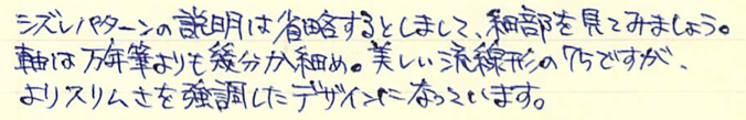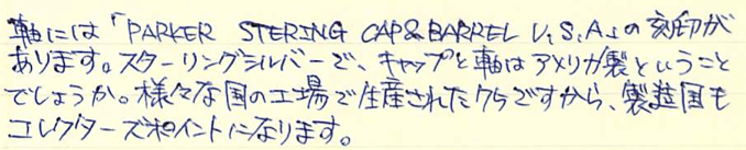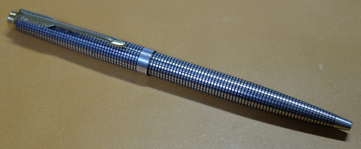 レビュー:PARKER 75 シズレ ボールペン Category:筆記具 Date:2014年10月03日 趣味の文具箱vol.31を買いました。特に気になったのはビンテージ・モンブランの記事とファーバーカステルの新製品でしょうか。デスクセットは海外では販売されていた気がしましたが、日本でも販売するんですね。値段がすごいことになっていましたが・・・。前回、もう少し黒い方が良いという記事を書いたモンテベルデのソフトロールリフィルですが、ブルーブラックとしてではなく、青色としてみると非常に好みの色であることに気付き、愛用するようになってしまいました。 万年筆はXFがよく見られ、M以上の字幅のものはほとんど見ませんね。バリエーションとしてはボールペンは比較的よく出てきますが、ペンシルはかなり珍しい気がします。 それにしても、この絶妙な流線型のフォルムはなんとシズレパターンとの相性が良いことか。スターリングシルバーの持つクラシカルな雰囲気はもちろん、気取りすぎない実用性も感じられる絶妙のデザインだと思います。ボールペンは万年筆よりも細め。ペン先に行くに従って細くなって行きますが、シズレパターンが滑り止めになって、決して持ち難い訳ではありません。 天冠がフラットなものの方が時代が古く、新しいものはこのようにくぼみがあるようです。万年筆は首軸のダイヤルの0の文字の有無などでもだいたいの生産年数をつかむことができます。 イギリス、フランス、アメリカ、珍しいところではオーストラリアのものもあるそうです。わたしが所持しているものは、シズレがアメリカ、プラスヴァンドームがフランスです。万年筆はシルバーがはがれてしまっている部分がありますが、このボールペンは非常にきれいにパターンが残っています。なんとも美しいですね。 ベクターにもスライドノックのものとノックボタンのものがあるので、伝統的にパーカーはどちらも作っていたのでしょうか。時期によって違っている可能性もありますね。 PR