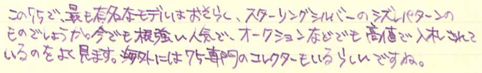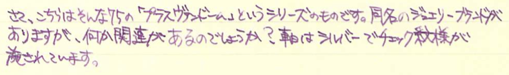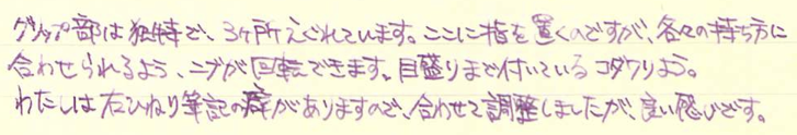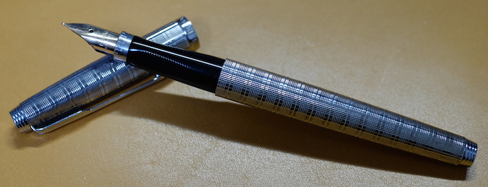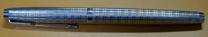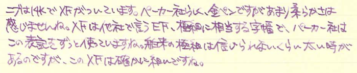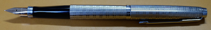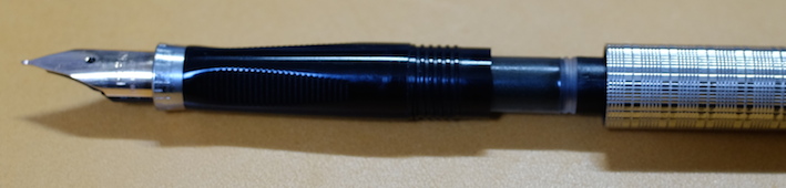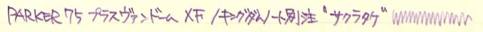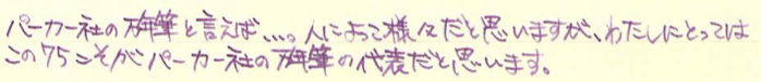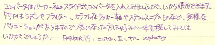 レビュー:PARKER 75 万年筆 プラスヴァンドーム Category:筆記具 Date:2014年05月18日 久しぶりの万年筆ですね。そして初めてのパーカー社の金ペンでもあります。ある意味王道ともいえる、パーカー75万年筆のご紹介です。 パーカー75は60年代の発売で、現在の後継モデルはソネットです。まさにパーカー社の顔とも言うべき筆記具ですね。とんでもない量が売れたヒット製品でもあります。 パーカー45、デュオフォールドなど、パーカー社の万年筆には数多くの逸品があります。わたしは万年筆に興味を持ち始めた頃から、いつか手に入れてやろうと思っていました。 シズレパターンはフライターと同じくパーカー社を代表する仕上げで、イギリスの嗅ぎタバコの箱の文様をイメージして作られたらしいですね。75専門のコレクターは本当に多いらしく、海外オークションでは75がかなりの高額で取引されているのをよく見ます。 プラスヴァンドームという響きがそもそもフランスっぽいですが、こちらはまさにメイド・イン・フランスの製品です。しかしニブにはUSAの3文字が。国際企業のパーカーらしいといえばらしいですね。 字幅はペン芯の部分にガッツリと彫られていますので、大変分かりやすいですね。パーカー180もM/XFと記載されていますし、ずっとこうみたいですね。 2カ所には写真のようなすべりどめパターンが入っていますが、残りの1カ所には入っていなかったりと、この辺は人間工学に強いパーカーのこだわりなのでしょうか。画像でも分かりますが、ニブ調整用の目盛りが入っていますね。初期生産のものには数字まで入っていたらしいですよ。 もちろん、回転式コンバータやカートリッジインク、はたまた古いスポイト式のものまでしっかりと使用することが出来ます。この辺はパーカー社の製品は心配しなくても良いので大変助かります。75は質の良い中古がオークションにも多々出てきますし、その生産量の多さから、未使用品が町の文具店に残っていたりもするので、ご自分の一本を探してみるのをお勧めします。いい品物ですよ。 PR