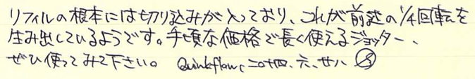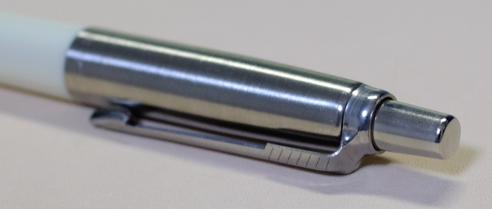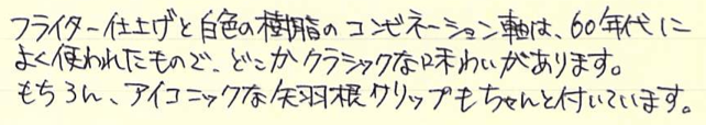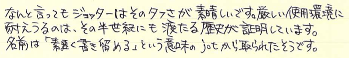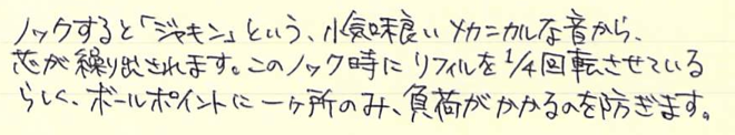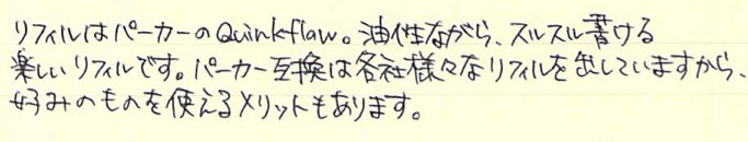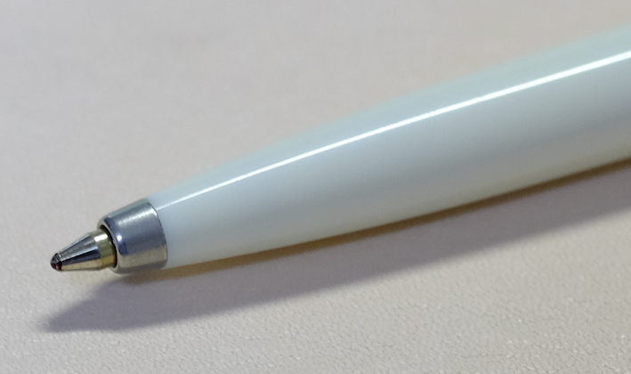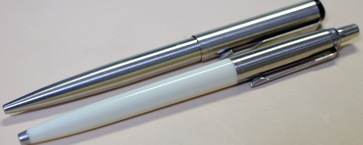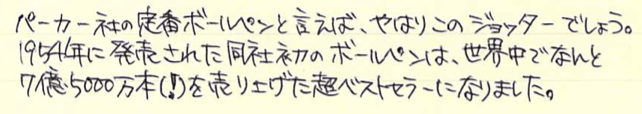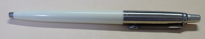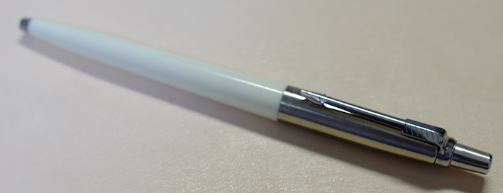 レビュー:PARKER Jotter オフホワイト Category:筆記具 Date:2014年06月28日 近頃、パーカー社125周年記念モデルも発売され、ますますバリエーションが豊富になるこちらのジョッターです。過去のものも含めると、いったい何種類になるのやら・・・。 一本持っていると頼もしいボールペン。それがこのジョッターならばなおさらです。スリムな流線型の軸に機能性とタフさを詰め込んだパーカー社の代表作ですね。 歴史あるロングセラーと言う意味では、横に並んでいる45万年筆と似たような位置づけですね。45は最近、惜しまれつつも廃盤になりましたが、このジョッターは現役バリバリです。 母親がジョッターを随分使い込んでいますが、壊れる気配もないし、インクも切れないしで気に入っているようです。値段の割には高級感があるのもポイントです。 先ほどの45もそうですが、万年筆でも樹脂の軸にキャップのみ金属、という製品が国産でも舶来でも多々ありましたね。流行のデザインというものは何にでもあるんですね。 尾軸ごと稼働するノックのベクターと異なり、このジョッターにはノックボタンがあります。軽くも重くもなく、適度な手応え。ペン先のがたつきも無く、素晴らしい機構です。 わたしは基本的にモンテベルデのジェルペンリフィルを多用しています。現在使用頻度が最も高いペルナンブコボールペンにもブルーブラックを使用中。このクインクフローも油性という違いこそあれ、スラスラ系で書きやすいですね。 友達に勧めるなら、わたしはベクターかジョッターですかね。値段もさることながら、本当に実用的でかわいいボールペンです。リフィルが豊富なのもこだわりのポイントですね。 PR