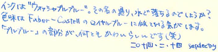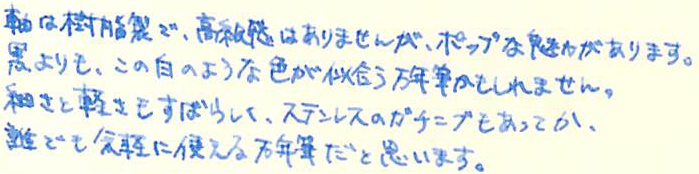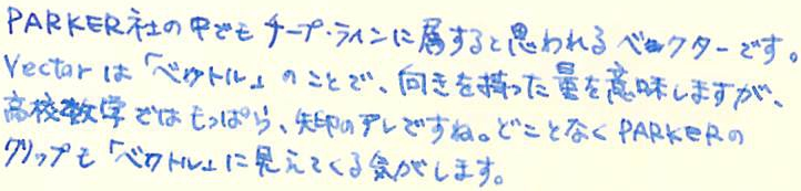レビュー:PARKER Vector Category:筆記具 Date:2014年02月14日 ベクトルは高校時代割りと得意でした。空間ベクトルだと図示しにくいのが ちょっと面倒でしたが。こんばんわ、sepdectryです。 ワンチャさんでバレンタインデープレゼントと称しまして、 万年筆購入者にボトルインクのサービスをやっているようです。 インク欲しさに購入したのが今日ご紹介しますVectorです(笑 この世のものとは思えないほど固いブリスター・パックに入ってました。 紙箱とかで良いと思うのですが。フックにかけて陳列できるから パックにしたほうが利便性があるのかな? ちなみに向きを持たない量は「スカラー」というらしいです。 キャップを尾軸の部分にポストすると、スッとしたラインを持つ 一本の線のようになります。まさに Vectorですね。 素材自体は高級なものではないのですが、こういうデザインと PARKERのもつ矢のイメージから、かなりセンスのいい製品だと思います。 ノブレスよりは一回り太いですが、それでも通常の万年筆よりは細く、 メーカーではスリムラインに属する軸だと思われます。 PARKERのコンバータが使えるそうなので、入手してみようと思います。 鉄ペンらしい鉄ペンだと思います。 ニブは小さめかな?通常のオープン・ニブと比べて短く、 全体がカーブしているのもあって、ガチガチのニブです。 布製の一本ペンケースつき。値段にしてはいいオマケです。 ファスナートップもパーカーのエンブレムで、まあ悪くはありません。 まぁ、水で落ちないインクの方が珍しいんですけどね。 古典ブルー・ブラックもかなり減ってますが、需要が完全に無くなることは 無いと思いますので、ラインナップには残しておいてほしいですね。 PR