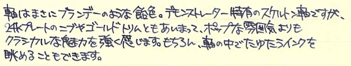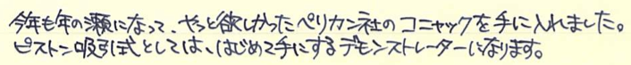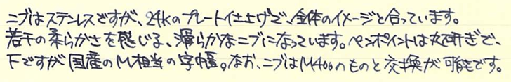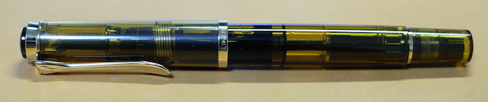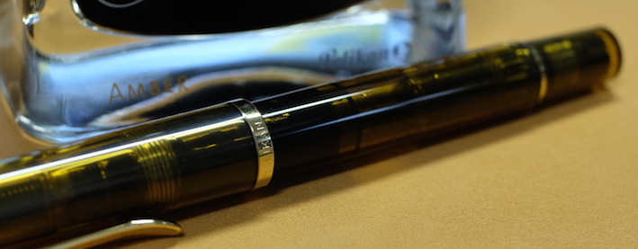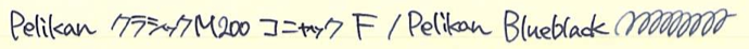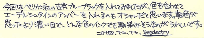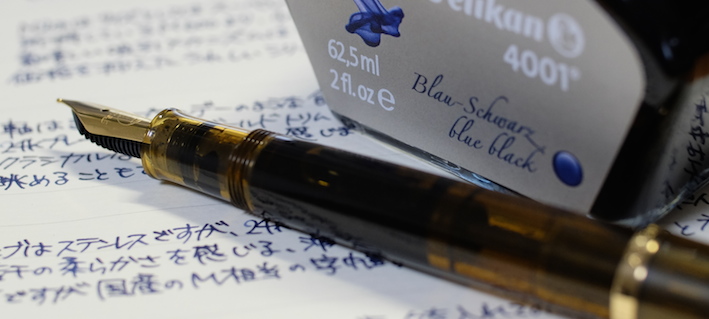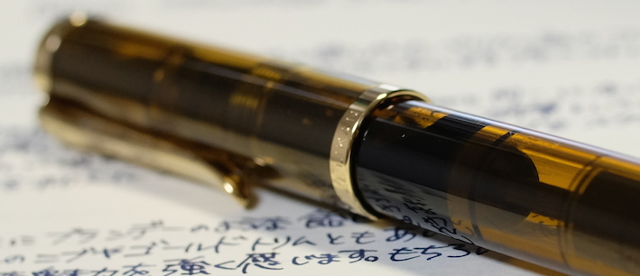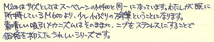 レビュー:Pelikan M200 コニャック Category:筆記具 Date:2014年12月17日 記念すべき?200個目の記事にちなんで、本日はペリカンの限定品、M200をご紹介します。M200にはクラシックやトラディショナルなどの枕詞が付いていることが多いですね。限定色が多いシリーズでもあり、M205などのバリエーションも豊富です。このM200コニャックは今年の夏ごろに発表された限定色であり、日本で3000本が流通しているようです。字幅はEF、F、M、Bの4種類。今回はFを選んでみました。 デモンストレーター軸でみると、ペリカンの吸引メカニズムがいかに洗練されているかが大変よく分かります。定価は14000円ほどですが、インターネット通販では最安で9000円ほどから販売されています。 ともすればチープな雰囲気になりがちな透明軸ですが、このために作られたという飴色の大変美しい透明樹脂とゴールドで統一された金属パーツが相まって、とてもエレガントな雰囲気になっています。この辺はさすがペリカンといったところ。 今回びっくりしたのがこのニブで、ステンレスニブということで、正直なところあまり期待はしていなかったのですが、ペリカン社に謝りたい気持ちです。万年筆特有の滑らかさを存分に味わえる、大変素晴らしいニブになっています。 色といい、メーカーといい、2013年のエーデルシュタインの限定色、アンバーと非常に相性が良さそうな万年筆なのですが、一年遅れで発売されたこともあり、アンバーが入手困難になっているのは残念ですね。いつかはアンバーを入れてみて文字を綴ってみようと思います。 PR