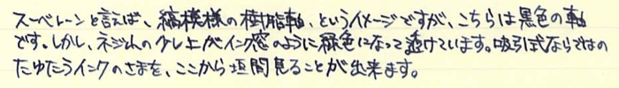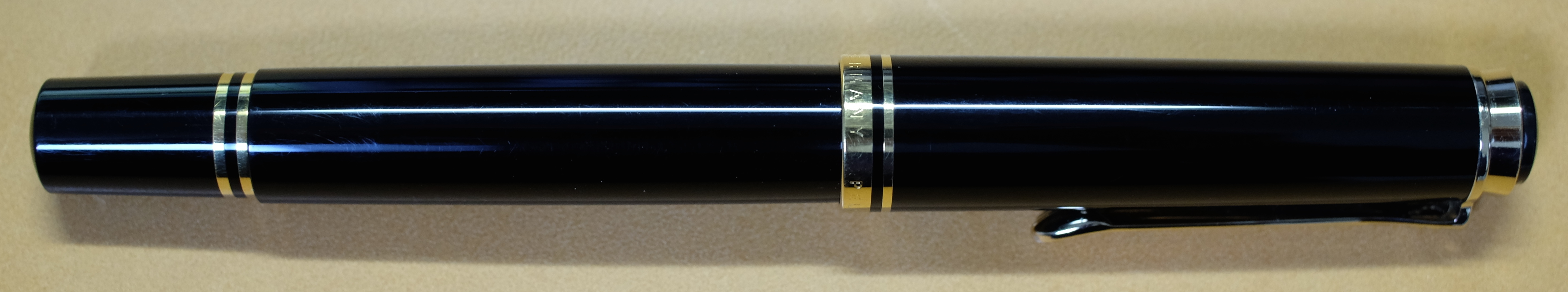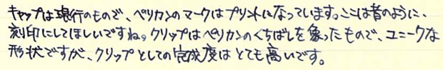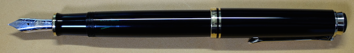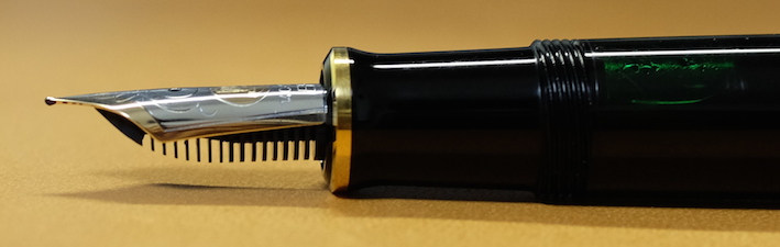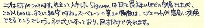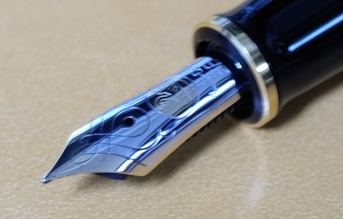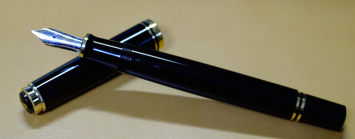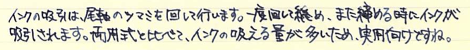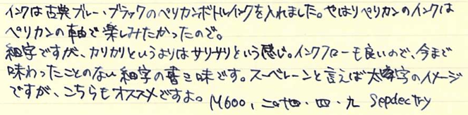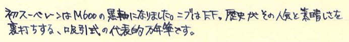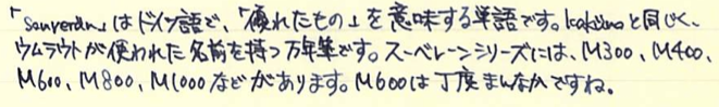 レビュー:Pelikan M600 Souverän Category:筆記具 Date:2014年04月09日 四月も中旬に入り、桜がとても奇麗ですね。わたしの住んでいる地域でもちょうど桜が満開になっておりますので、休みの折に花見にでも行こうと思います。 ペリカンのスーベレーンといえば、モンブランのマイスターシュテュックと並ぶ舶来万年筆の二大巨頭ですね。 フルハルターさんの調整されたものなど、専門店でも取扱いの多い銘品中の銘品ですね。 カクノは、どちらかというとシャレの領域で「ü」を使っている感じですが、このスーベレーンは正真正銘のドイツ語です。uウムラウトは日本語の発音で言うと、「ゆ」、aウムラウトは「え」に近いでしょうか。oウムラウトは日本語で近い発音は無いですね。ですので、カクノは本当は「カキュノ」くらいになるのかな?実際ドイツではどう呼ばれているんでしょうかね。少し気になります。 このインク窓的な透けている部分がこの黒軸のデザイン的ポイントだと思うのです。吸引式の美しさを端的に表すには、どこかを透けさせるのが一番かな、と。しかし、ここを深緑色のクリアにするのがにくいですね。一見、ただの黒軸に見えます。 シグナムは、あれはMくらいの太さでしょう・・・。ニブユニットは単品で売っているのですが、10000円強くらいするんですよねぇ。このM600を8000円ほどで入手したので、新品とはいえ、ニブの方が高いという。 吸引式はラミー2000に続いて二本目なのですが、こちらもいいですねぇ。工作精度もさすがの高さ。吸引式の良さを十二分に味わえる製品だと思います。 仔ペリカンが二匹のものも、昔はあったりして、この天冠部分のデザインについては、実はさまざまなバリエーションがあります。 このスーベレーンに関しては、太軸は細字、細軸は太字で楽しみたい、というわたしの個人的な好みがありますので、もしもう一本入手する機会があれば、M300系の太字を是非、手に入れてみたいですね。 PR