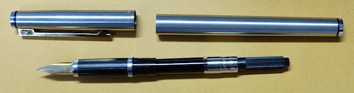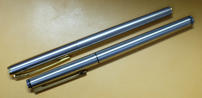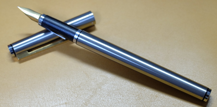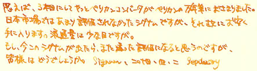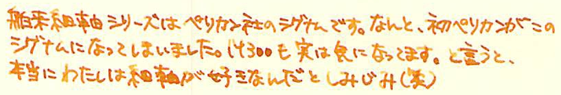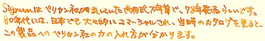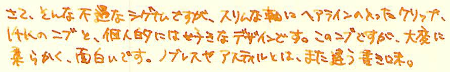 レビュー:Pelikan Signum Category:筆記具 Date:2014年04月02日 アスティルのことを「賛否両論」と紹介しましたが、このシグナムについては圧倒的に「否」が多いです。何故でしょうかね。 インクはエーデルシュタインの2013限定色、「Amber」を入れました。まさに琥珀色ですね。良い色だけに、限定なのがもったいないなぁ。 M300はあの細さでちゃんと吸引式なのがすごいですよね。兄弟モデルのM320も含めて、気になる所ではあります。 ゴールド、シルバープレートのモデルやこのマット仕上げのモデル、全体にヘアラインが施されたモデルなど、かなりのバリエーションがあったようです。ちなみにわたしの所持しているものは、「Signum560」というモデルのようです。 シグナムが姿を消してちょっと後にニュークラシックという細軸のモデルが出たりもしましたが、こちらもすぐにカタログ落ちしたようです。現行ペリカンの細軸といえば、現在はM300ですね。(そんなに細くないですが) そもそも、80年代の万年筆には流行なのか、こういう仕上げが数多くみられます。 ニブはかなり薄いです。シンプルなつるんとした形状で、この薄いニブで、14K。よって、ものすごく柔らかいです。EF?これが?といった字幅でもあります。ペンポイントは小さいので、EFには間違いないのでしょうが。フローも良いです。が、全体的にフローが渋いのがこのシグナムの常だそうなので、この個体の特長かなと。 規格の統一と消耗品の流通は、万年筆にとって評価の一端ですよね。その製品独自規格のコンバータを出すのはいいとして、ちゃんとカタログ落ちした後も流通させてほしいですね。 うーん、偶然似た仕上げのものを手に入れたこともあって、ノブレスとそっくり。 コンバータを3本、ボトルインクを2本手に入れての、ようやく万年筆1本。ペリカンコンバータって本当に使い勝手がいいんですよ。手に入れておいて損は無い!このシグナムも、もっと愛してくれる人が増えればいいな、と思います。 PR