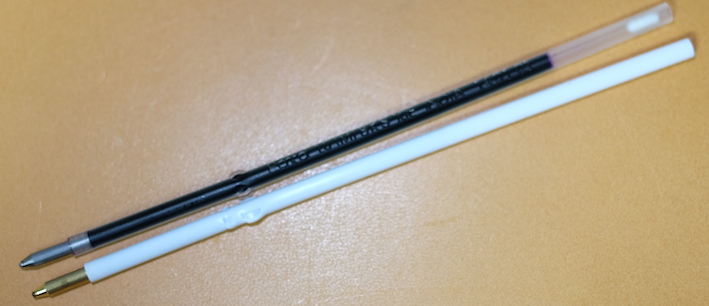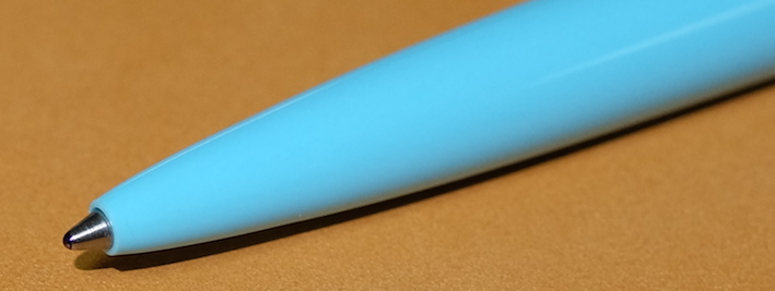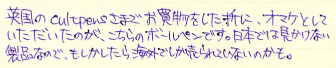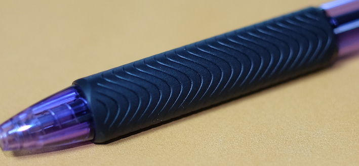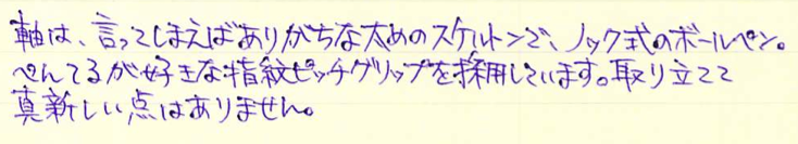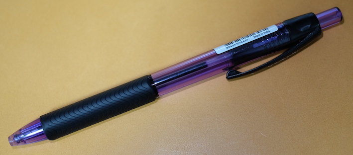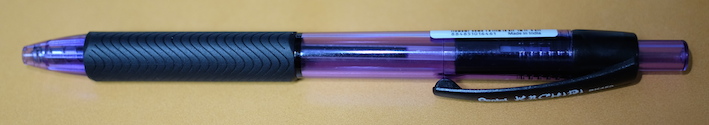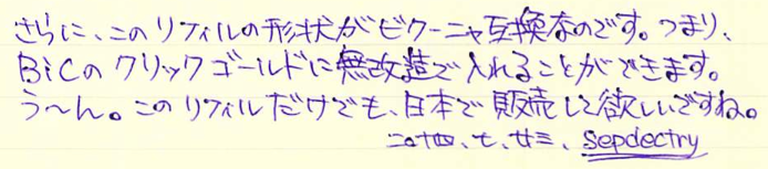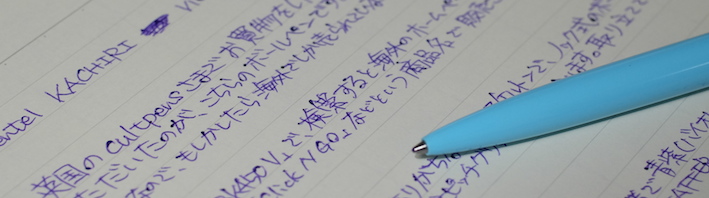 レビュー:Pentel KACHIRI Category:筆記具 Date:2014年07月23日 今回の製品の入手経路はちょっと特殊で、次回また手に入るかどうかは分からないです。こういうちょっと珍しい品こそ御紹介するべきかなと思いましたので、記事にします。 名前はぺんてるのカチリ。どうやらノックしたときの音から取られている名前のようです。 先日記事にした、スーペリアペンシルを購入した際のオマケとしていただいた品なのですが、英国のサイトで買い物をしたオマケが日本のぺんてるの製品というのもちょっと面白いですね。 型番で検索をかけると出てくる「Click N Go」は、軸の形状は全く一緒なのですが、リフィルの色が黒固定らしいので、この製品と関連性はあれど、別物かも知れません。 ぺんてるは本当に、ことあるごとにこの指紋ピッチグリップを採用してきますね。確かに手馴染みは良いのですが、見た目が好みかと言われるとちょっと・・・。 油性ボールポイントはほとんど、黒赤青緑の四色が主流で、他の色はあまり見かけませんのでこういう色のリフィルは貴重な存在だと思います。エルバンのヴィレオパンセのような、美しい青紫色で、使いたくなるような色です。 この通り、無改造でしっかりペン先が露出しますし、ガタつきもなく使えてしまいます。ビクーニャ互換芯が使えるということはKITAさまのブログで拝見していたのですが、今後こちらの製品が日本でも発売するとなると、よりリフィルの選択肢が増えることになりますね。 PR