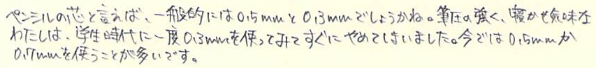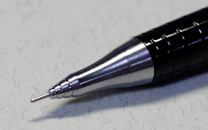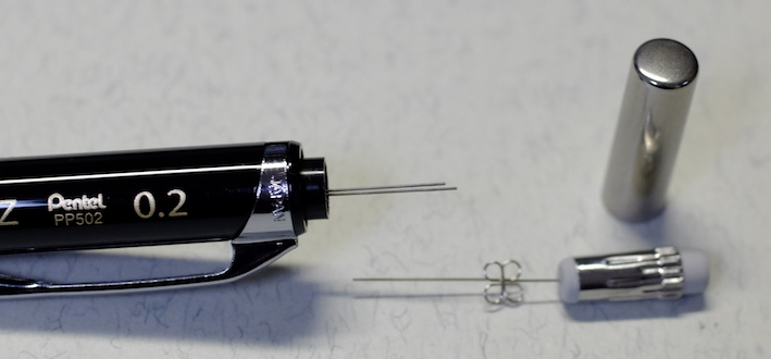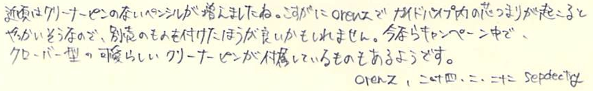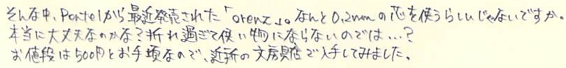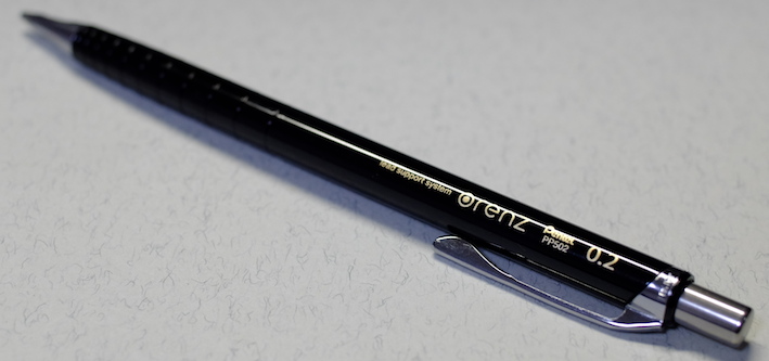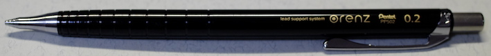 レビュー:Pentel Orenz Category:筆記具 Date:2014年02月22日 あちこちで話題になってますね、PentelのOrenz。0.2mm芯を使うペンシルは 過去にもあったのですが、このOrenzは新開発の「オレンズシステム」とやらを 採用することにより、使い勝手が良くなっているそうです。期待できそうですね。 ラミー2000ペンシルは0.5mm、ファーバーカステルグリップ2011は0.7mmを使っています。 ヨーロッパでは0.7mmが主流みたいですね。逆に複雑な文字を使う日本では0.5mmが好まれる。 この細字、太字の関係は万年筆にも共通していますね。 色はホワイト、ブラック、ピンク、イエロー、スカイブルーの五色展開です。 無難にもブラックを選択しました。黒軸にゴールドの文字がいい感じですね。 この絞りがいいですねぇ。スマートな中にもしなやかさが感じられます。 ガイドパイプの細いこと細いこと!これだけで芯なんじゃないかと見まがうほどです。 通常のペンシルだとガイドパイプから少し芯を露出させた状態でないと筆記できませんが、 このOrenzは逆に芯が露出した状態だとすぐ折れてしまい筆記ができません。 上の画像のように、ガイドパイプしか見えない状態が適切な筆記可能状態です。 分解してみましょう。真鍮製のバネとパイプ。バネが通常のペンシルより長いですね。 0.2mmの芯を保持する芯チャックも大変ですよね。たまには労ってあげてください。 ちなみに芯を入れた状態で分解、組立をするとイライラ棒並みの緊張感を味わえます。 優秀なシュタイン替芯でも、0.2mmともなると抜身ではすぐ折れます。 最近のクリーナーピンのないペンシルで芯詰まりが起こったら皆さんはどうしていますか? わたしは昔から芯を一本取り出して、ガイドパイプに逆から差し込んで摘出しているのですが 授業中にやって教師から「遊ぶな」と注意されたことがあります。社会の理不尽さですね。 PR