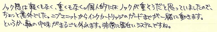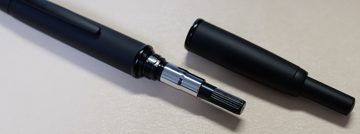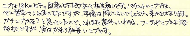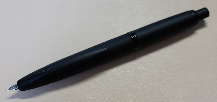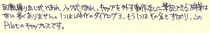 レビュー:Pilot キャップレス マットブラック EF その1 Category:筆記具 Date:2014年06月10日 今や万年筆は実用筆記具の座を退いて久しく、書式や文書に使用出来る色などにかつての隆盛の痕跡をかすかに窺い知ることが出来る程度になってしまいました。 完全に万年筆が趣味の筆記具になってしまったと言うと少々語弊があるかもしれませんが、現状、一般筆記にはペンシルやボールペンが用いられるのが一般的ですね。 パイロット社が初のキャップレス万年筆を開発したのが1963年ということなので、何と半世紀もの歴史を持つ製品になります。途中、生産されてない時期もありましたが。 当初、キャップレス万年筆は回転繰り出し式だったと聞いています。現在販売されているキャップレス万年筆はパイロットのキャップレス三兄弟、ラミーのダイアログ3・・・後はイタ万であった気がしますが、詳しくは覚えていません。 これは万が一、インク漏れがあった時にペン先がクリップの位置にあることでこぼれるのを防ぐ目的があるらしいです。そもそも、然う然う漏れるものでもありませんが・・・。筆記するときにクリップが邪魔だ、という声もあるようですが、わたしはこの手の製品にはクリップは必須だと思っていますし、かといってノック側につけるのも確かに怖いかなと思いますので、この形状がベストでないにしろ、次善かなと考えています。 ニブユニットからコンバータの回転部分までが一緒にノックで繰り出されるようです。したがって、カートリッジか何かを刺していないと繰り出しがされません。これについては、カートリッジインクを使用する際につける金属製のキャップが付属していますので、インクを抜いて保管の際にはそれを装着すれば良いでしょう。 ただし、この筆記感がキャップレス全てに当てはまるものなのか、EF特有のものなのか、もしかしたらこの個体だけのものなのかは分かりません。が、少なくともEFに関しては穂先に沿ってかなり細いニブですので、柔らかさは感じると思います。 軸色や軸の太さ、半世紀もの間磨き込まれたキャップレスのシステムなどは次回御伝えしようと思います。 PR
