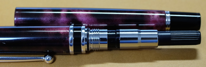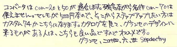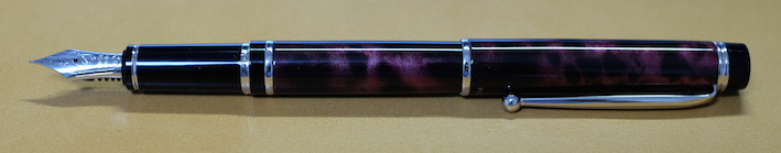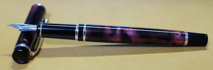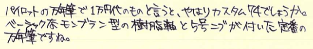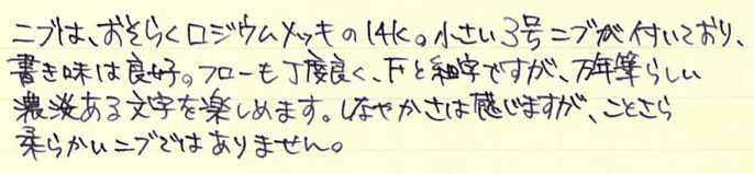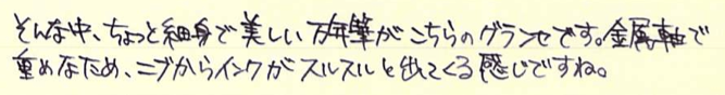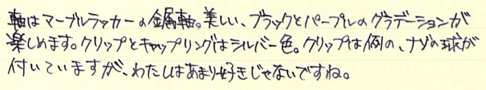 レビュー:Pilot グランセ F Category:筆記具 Date:2014年06月30日 6月ももう終わり。夏の入口ですね。今年の夏は長期の出張がありますので、更新が止まるかも知れませんので、ご了承ください。少なくとも頻度は減ると思います。 と、いうことで本日はパイロットのグランセです。さまざまなバリエーションがありまして、こちらは廃盤のものになります。銀軸もあったりしますよ。 カスタム74はニブにもEFからBBまでの種類がありますし、パイロット社万年筆の王道として確固たる地位を築いていますね。愛用者が多いのも頷けます。 太めの樹脂軸で軽いカスタム74、細身の金属軸で重めのグランセと、ある意味正反対の両者ですが、価格帯は同じくらいになっています。 なんと言うか、宇宙空間を想起させるような味わい深いパープルグラデーションです。これが廃盤になってしまったのはちょっともったいないですね。需要はあると思うのですが。この謎の球ですが、気に入っている人はいるのでしょうか、あまり良い話は聞きませんが・・・。 優秀なパイロット製のペン芯の影響もあって、書き心地は良いです。ペンポイントにかけての穂先は長めですが、モンブランのノブレスほどの弾力性はありません。が、ガチニブでもないです。 せっかくきれいなパープルなので紫色のスカビオサを入れてみましたが、季節に合わせて色彩雫の山葡萄なんかを入れてもいいかなと思います。江戸紫は限定でしたので・・・。 PR