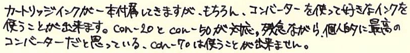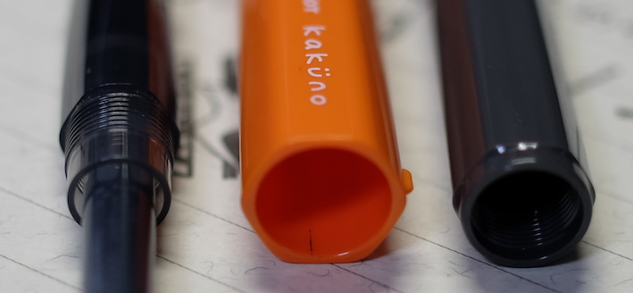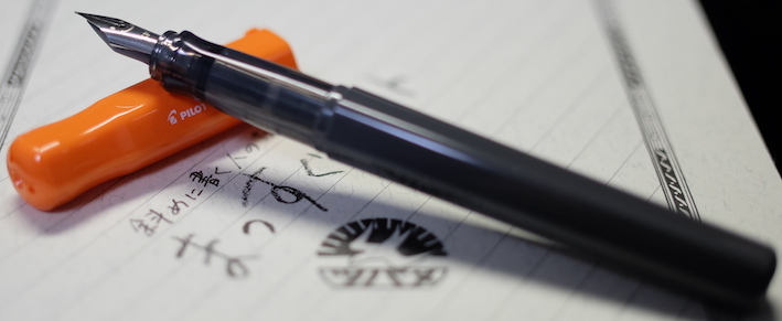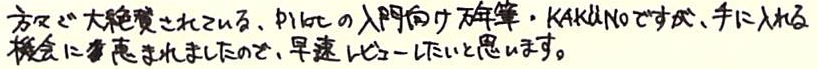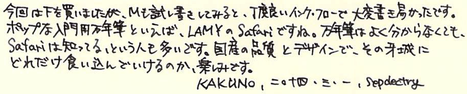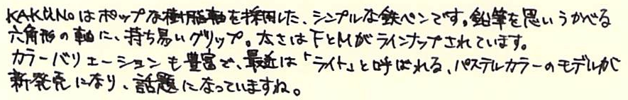 レビュー:Pilot KAKUNO F Category:筆記具 Date:2014年03月01日 人生には、自分自身に対して体の良い言い訳を考えてやらねばならないことが多々あります。 例えば、もう何本も万年筆を持っているのに、さらにもう一本欲しくなったときなどでしょうか。 このKAKUNOは、国産の鉄ペンを使ってみなければなるまいという、全くもって 意味の分からない理由で購入しました。趣味の世界ってそんなものだと思います。 こんばんわ、sepdectryです。 このKAKUNO既に皆様が素晴らしいレビューをされております。 いわゆる、文房具レビューブログはもちろんのこと、 モノレビュー系のブログでもかなり取り上げられていますので、 万年筆としては、かなり注目度の高い商品だと言えるでしょう。 「入門向け」と書きましたが、実際大人が使っても十分満足できる製品です。 六角形の軸に、三角形のグリップ。手馴染みの良さを考慮した形と 転がりにくく、使いやすい形が融合した、良いデザインだと思います。 キャップの色が豊富で、例えばコンバータを使って同社の色彩雫を 色別に吸わせて使うのも面白そうですね。 今度発売したパステルカラーのモデルは、この「えがおのマーク」が ウィンクしたものになっているらしいです。この製品のアイコンだと言えるでしょう。 ニブはかなり固めで、ボールペンに慣れた人でも違和感無く使えると思います。 ノートなどに書き込むにはF、万年筆らしさを味わいたいならMがいいでしょうか。 見ての通り、軸が太そうなので一見con-70が使えそうなのですが、 残念ながらcon-20とcon-50しか使えないらしいです。 お店ではコンバータが欠品していたので、色合わせで一緒に購入した 色彩雫の冬柿はまだ入れれてません。コンバータが届くのが楽しみです。 EFもなかなか需要がありそうです。日本の文字はいかんせん細かいので、 手帳に書き込む場合にはFでもちょっと、という人が多いと思います。 巷では、習字ペンのEFニブをKAKUNOに突っ込んで使う人もいるらしいです。 わたしは色彩雫を入れてライン引きに使おうと思っています。 PR