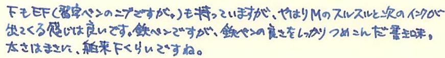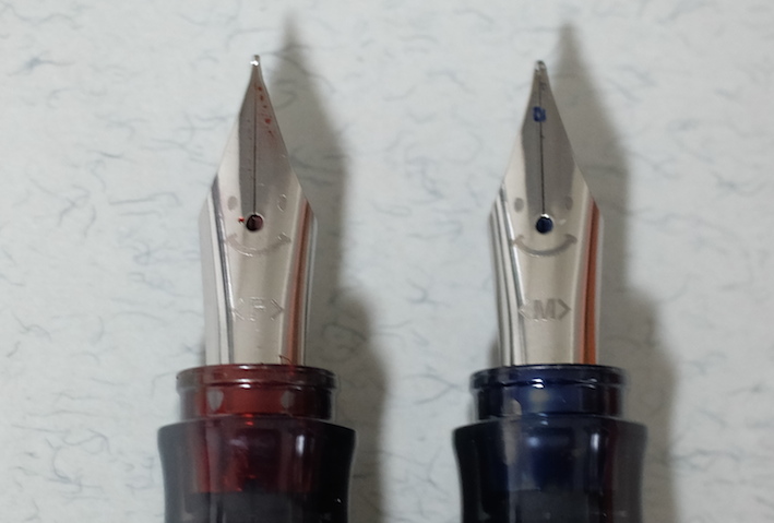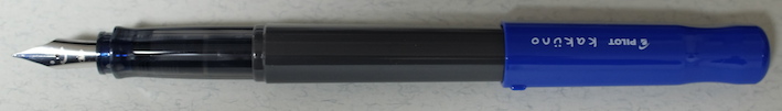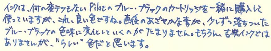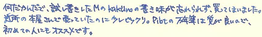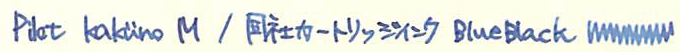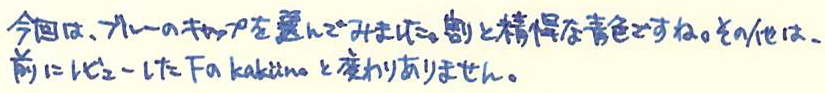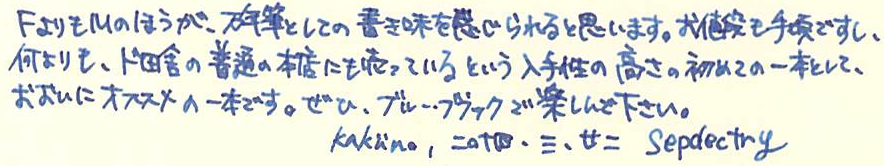 レビュー:Pilot KAKUNO M Category:筆記具 Date:2014年03月22日 近所の本屋さんに寄ったところ、カクノが置いてあったのでついつい手が伸びてしまいました。 パステルカラーの新色だったらもっと良かったのにな。sepdectryです。 というわけで、今回は青キャップを買ってみました。ニブもMです。 ちなみに、プラチナ万年筆のプレジールも置いてありました。セーラーは無し・・・。マイファーストを置いてあげてください! 上の画像をみると分かりますが、違いはMの刻印とペンポイントくらいです。それぞれ、キャップの色に合わせたインクの色が半透明の軸から見えてきれいです。 スッキリと潔い青色。カラーバリエーションが豊富なのも、カクノの良い所ですね。サファリのように、年別で限定色を出したりしても面白いよなぁ。 実は、パイロットのブルーブラックはこれが初めてなのですが、良い色ですね。ボトルインクで欲しくなりました。他に、この本屋さんにはシェーファーやパーカーのカートリッジインクまであったのですが。何故仕入れたのか謎です。パーカーのは確保してしまいました。その他、Montblancのボールペンフィリルまであったんですよ。以前は軸も置いてたのかな・・・。 何よりも、こんな田舎の本屋さんにおいてあったのに嬉しくなってしまいました。カクノは順調に普及していってるな、と。 PR
