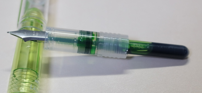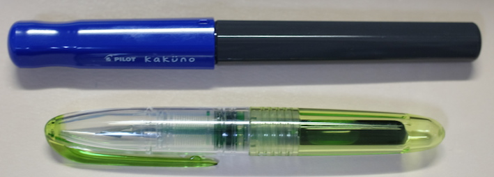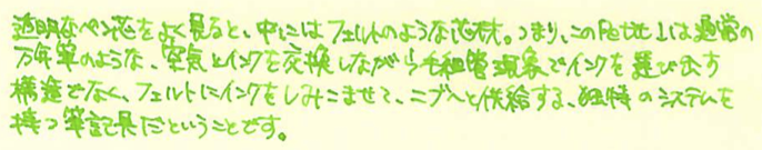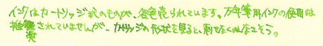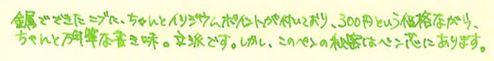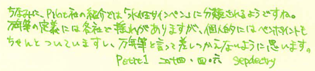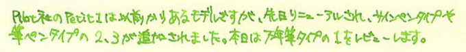 レビュー:Pilot Petit1 Category:筆記具 Date:2014年04月06日 二つ隣の市にある文具専門店に行ってきました。専門店だけあって、万年筆もそこそこの品揃え。とりあえず消耗品と面白そうなものを二、三購入しました。このペチットもそのひとつです。 プラチナのプレピーもそうですが、さすが国内メーカーだけあって、500円もしないような廉価版の製品でも本当によく作り込んであります。 万年筆含む三種類のペン先と、八種類のインクの組み合わせを選べる製品です。インクは替えのものがしっかりと売っていますので、愛着のある軸を壊れるまで使えます。この辺は嬉しいポイントですね。 こうしてみると、雰囲気がスティピュラのパッサポルトに似ていると思いませんか?値段には天と地ほどの差がありますが(笑 毛細管現象を使うペン芯よりも、フェルトを使った方が確かにインクの供給量も安定しますし気圧の変化などにも強いですね。しかし、一度インクがしみ込むと万年筆のペン芯よりも洗浄が難しいでしょうし、別インクの入れ替えは考えられていないのだろうと思います。低価格帯の製品ですし、手軽さを重視してこういう機構にしたのは正解だと思いますね。 実際のところ、このペチット用のカートリッジをカクノに刺している人もいるらしいですし、その逆も問題なく刺さるし、使えるのだと思いますが、前述の通り、特殊なペン芯ですので想定外のインクを通したときに問題が起こらないとも言い切れないですね。 逆に、キャップをポストするとある程度の長さにはなりますので、持ちにくいわけではありません。この辺はパッサポルトと一緒ですね。勘合式のキャップですが、首軸側と尾軸側のでっぱりの大きさが違っており、キャップを閉めたときとポストしたときの感覚が違います。ドライアップ対策に、首軸側はキツめになっている、ということでしょうか。 最後に、カクノとのサイズ比較。比べてみれば分かりますが、かなり小さいです。手軽に使える万年筆タイプのペン、普段馴染みの無い方も、試してみてはいかがでしょうか。 PR