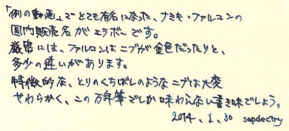 レビュー:PILOT エラボー Category:筆記具 Date:2014年01月30日 つづきまして、国産万年筆の雄、PILOT社からエラボーのご紹介です。 唯一無二といえる特殊ニブが生み出す独特の書き味にはファンが多いのも頷けます。 画像でも見て取れるように、くちばし状のニブによってとても弾力性のある やわらかい書き心地になっています。強弱をつけようと思えば、 他の万年筆では不可能な書き方も可能です。 同じくパイロット社の色彩雫シリーズから、月夜を入れて使っています。 シェーファー社のブルーブラックとはまた違う色合いですね。 色彩雫シリーズは集めだすと切りがないので、自制しています。 かくいう私も「例の動画」に魅せられて購入に至ったうちの一人です。 太さはSEF、SF、SM、SBがあり、私はSFを選んだものの、 試し書きしたSEF、SM、SBもとても面白い書き味で大変迷ったのを覚えています。 軸はメタルと樹脂がありますが、私は適度な重さのあるメタルが気に入っています。 軸色もブラックの他にライトブルー、ブラウンやレッドが設定されており、 再販前よりもバリエーションは豊富です。 おそらくエラボーだけではなく、フォルカンもフレックスニブ風の使い方をすると すぐに駄目になってしまうと思います。 あくまでも商品の想定の範囲内で楽しむのがよいでしょうね。 機会があれば、カスタムヘリテイジのフォルカンも入手してみたいと思います。 PR