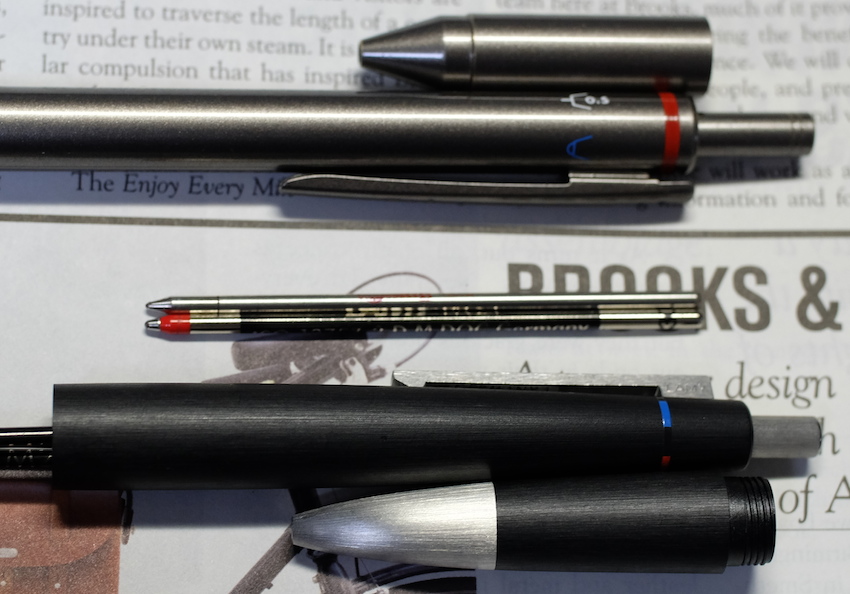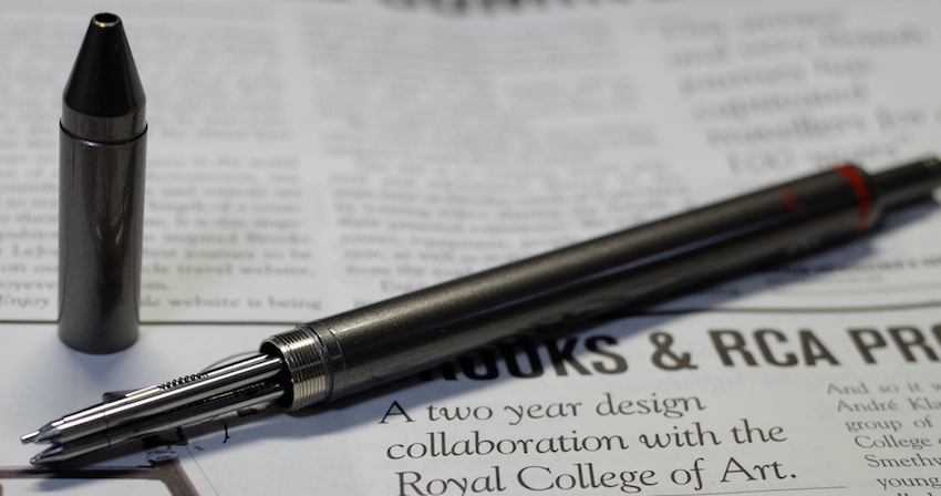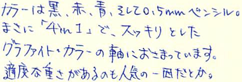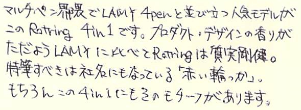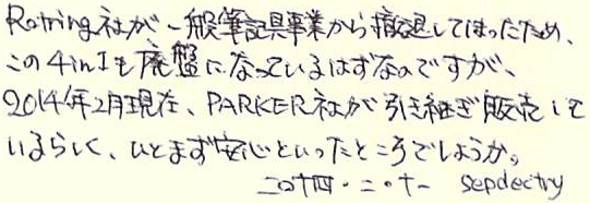 レビュー:Rotring 4in1 Category:筆記具 Date:2014年02月11日 今日は建国記念日でお休みでしたね。建国記念日っていったい何の日なんだろうと 調べると、神話に関係してるらしいです。神武天皇即位の日だとか。 祝日はいつぞやの国民の祝日に関する法律改正で結構動きましたが こういう日はさすがに動かす訳にはいかないですね。こんばんわ、sepdectryです。 4in1はいつか流行った4色ボールペン手帳術の影響でかなり売れたみたいですね。 リフィルはいわゆる「4c規格」。ラミーのものはもちろん、 日本のPilotやゼブラのそれとも互換があります。 が、ゼブラのものはすこし径が大きいらしく、たとえばラミーの 2000に入れたら穴が広がった!などの報告があるため注意が必要です。 レジン製の2000よりも、真鍮製の4in1の方が重いのは道理ですが、 どことなくバランスの良い重さのために、かなり使いやすいです。 この辺はさすが製図製品のメーカーといったところでしょうか。 リフィルの大きさも全く一緒。互換性があります。 両者ともに重力で内部のボールを転がしてペン先を選択する方法だと思うのですが 精度はラミーに軍配が上がります。4in1はペン先が内部で引っかかることも多いです。 この辺は個体差かもしれませんが、同様の問題は他の個体でも確認されているそう。 PARKER社の心意気に感謝、ですね。 PR