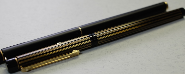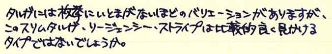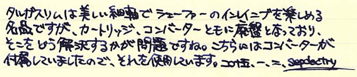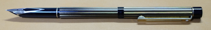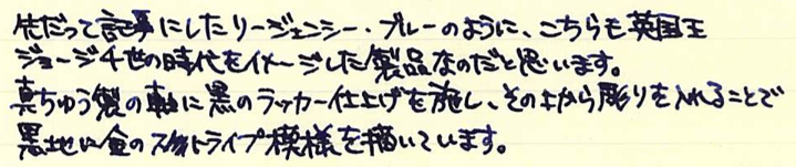 レビュー:SHEAFFER スリム・タルガ リージェンシー・ストライプ Category:筆記具 Date:2015年01月02日 新年明けましておめでとうございます。今年もよろしくお願いします。今年の新年筆はこちら、シェーファーはタルガスリムのリージェンシーストライプです。タルガスリムは既にブラックラッカー軸を持っていますので、二本目ということになります。 細軸で太字を書く・・・というのは何とも心地よいというか、贅沢な行為だと思います。このスリムタルガはMですが、国産で言うとBくらいの字幅でしょうか。 スリムタルガだけでも本当に色んな軸があり、本家タルガとなるとそれはもう数えきれないほどのバリエーションがありますね。コレクター人気が高いのも頷けるような・・・。このリージェンシーストライプはキングダムノートさまで購入しました。 調べてみたところ、確かにジョージ4世時代にリージェンシーストライプと言う名前の模様が流行ったようで、ソファなどの家具の布地によく使われたそう。定義は難しいですが、細めのストライプを束にして無地の部分とのコントラストを出すような模様のようです。このスリムタルガもそういった意匠が感じられますね。 この角度で見ると、シェーファーの上に反ったニブがはっきりと分かりますね。XF字幅のモデルよりも、Mのペンポイントが付いたことで、よりシェーファーらしい書き味になっていると思います。フローも良好。滑るように筆記することができます。 海外オークションのサイトでは、このコンバーターが恐ろしい値段で取引されているようで、ちょっとびっくりしています。スリムタルガ自体、海外の方が人気があるのかも知れませんね。 PR