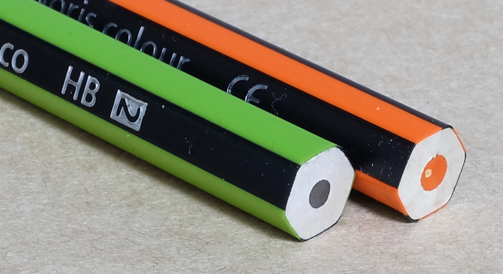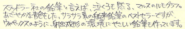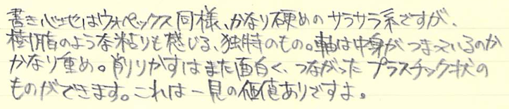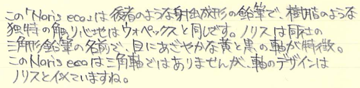 レビュー:STAEDLTER ノリスエコ Category:筆記具 Date:2015年04月05日 ステッドラーの製品は久しぶりの登場になりますね。ファーバーカステル派のわたしにとってはあまりステッドラー社の製品は使う機会がなかったりします。この鉛筆は、実は購入したものではなく、英国のCultPens様で買い物した際のおまけとしていただいたもの。毎回面白いおまけを付けてくれるのが嬉しいです。 職場でもプライベートでもファーバーカステルの9000番を使っていますので、わたしにとってのスタンダードは9000番になります。 ルモグラフは持っていないのですが、マルスカーボン芯を使う芯ホルダーを持っていますので、ステッドラー社の芯の優秀さはよくわかっています。減りにくくなめらかな書き味。 このノリスエコはウォペックスの流れを組む鉛筆で、木材を配合した樹脂を押し出し成形したものらしいです。通常の木材の鉛筆よりも、しっかりと詰まっていますので独特の重みがある点もウォペックスと一緒。 この削りかすは一見の価値ありで、こんな感じにずっと繋がって丸まっていくのです。木材を削る鉛筆よりも、削りはちょっと重めですが、これが楽しいのです。 この色鉛筆も同様の素材が使われています。色鉛筆らしく、芯の太さはノリスエコよりも太く作られています。芯の折れにくさは色鉛筆になっても同様。色は薄めなので、色鉛筆画というよりもマーキングに向いていそうな気がします。 PR