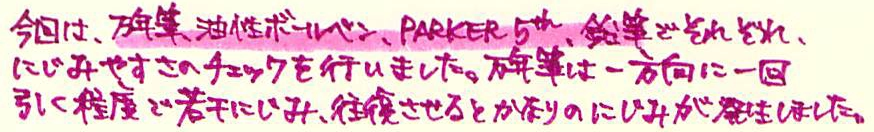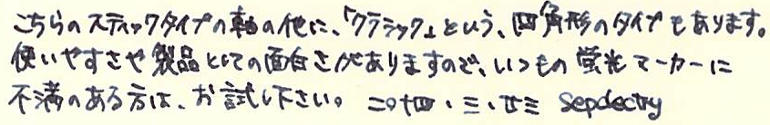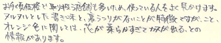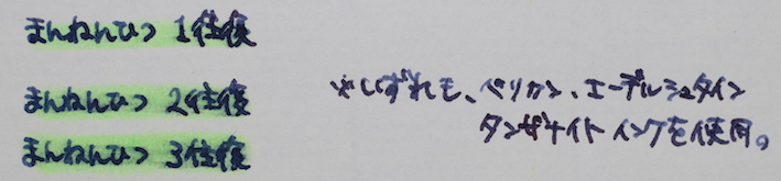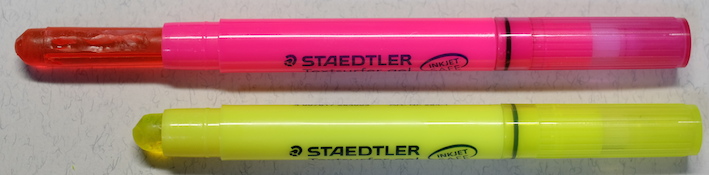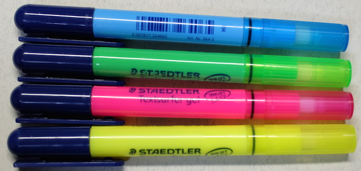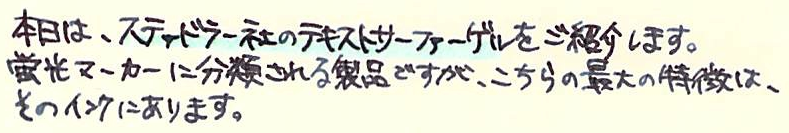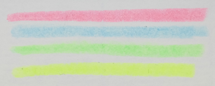 レビュー:STAEDTLER Textsurfer gel Category:筆記具 Date:2014年03月23日 先日ご紹介しましたビートルチップに続き、蛍光マーカー第二弾です。職務研修のときに前の席に座っていた同期が使っていまして、気になっていました。 インク、というか芯ですね。 書いてみた写真はこちら。上からピンク、青、緑、黄色なのですが・・・。 スキャナに取り込むとこうなります。緑と黄色がかなり薄れてますね。緑にいたっては、うすーい水色のようになっています。黄色は見えないです。 こちらはカランダッシュのゴリアットの上から。まったくにじんでいませんね。油性なのでまぁ、当たり前と言えば当たり前ですが。繰り出し式のものって、一度限界まで出してみたくなりませんか?スティックのりなんかは出しすぎて外れちゃったことが何度あったか・・・。 なんだかんだで、パーカー5thもにじみなし。優秀な製品ですね。いろいろ問題点もあるんですが。 鉛筆の上からは黄色のマーカーを引いたのですが、全く分かりませんね。とにかく、にじまないことは確かです。この製品の弱点は芯の特徴とも言えるヌルヌル感で、特にオレンジは芯が柔らかいためか、キャップ内で削れてしまうようです。ということでわたしはオレンジを購入していません。レビューブロガーとしては失格かもしれませんが(笑 最後に万年筆。通常の染料インクである、エーデルシュタインでテスト。さすがに3往復までするとにじみが目立ちますが、普通の水性マーカーだともっととんでもないことになってしまいますので、十分実用レベルだと言えるでしょう。 と、書きましたが、クラシックは通常の蛍光マーカーのようです。ちなみに「ドライ」という色鉛筆タイプもあります。うーん、使ってみたい(笑 PR